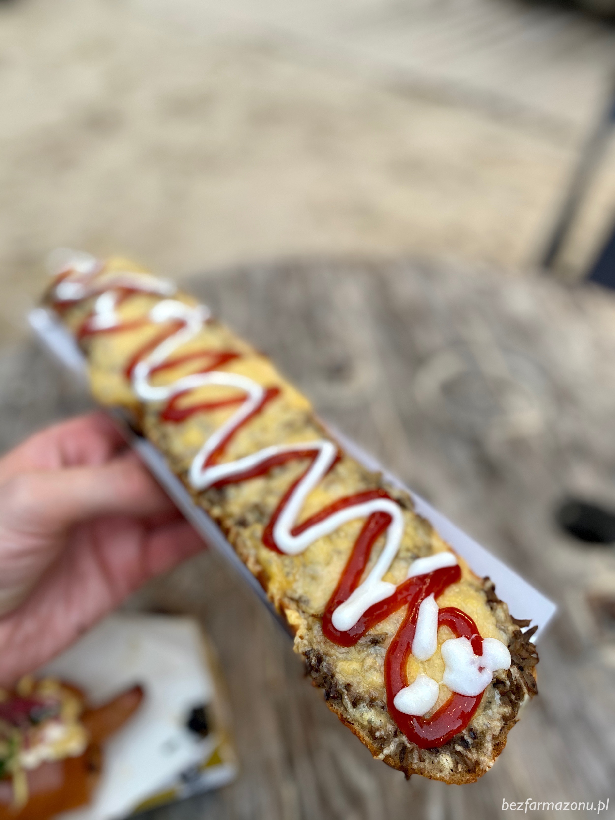 Każdy gryz to lekkie chrupnięcie, mocny zapach i smak świeżych „szampinionów”, finezyjne ciągniecie się nabiału i wykończenie Heinz’em (tak mi się wydaje). Nie posądzam właściciela o to, że codziennie smaży gar pieczarek z cebulą, ale ktokolwiek jest ich dostawcą zna się na rzeczy. Urzekły nas świetne chrupiące na zewnątrz i miękkie w środku bagiety.