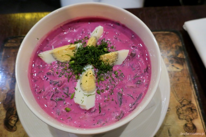 K. raczyła się chłodnikiem z botwinki (13 PLN) z jajkiem, rzodkiewką, świeżym ogórkiem i koperkiem i skwitowała tą zimną, bardzo treściwą i gęstą polewkę jako dobrą.