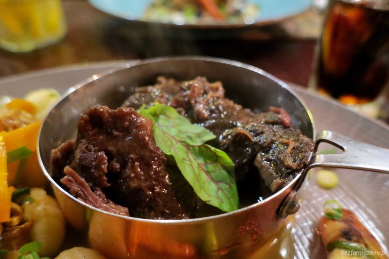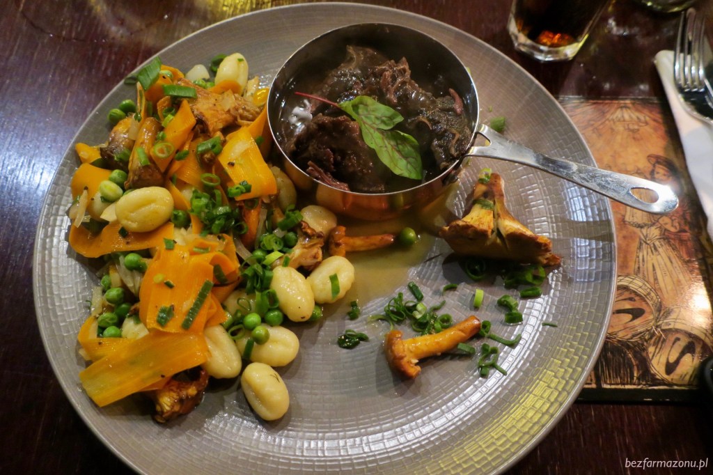 Danie główne wybrałem z karty specjalności i nie ukrywam, iż po podanych w ten sposób policzkach wołowych (43 PLN) spodziewałem się sztosu. Niestety zawiodłem się, gdyż mimo iż bardzo, ale to bardzo delikatne to smakowały jałowo. Nie miały aromatu i posmaku czerwonego wina na bazie którego miał być ich sos. Domowe kopytka owszem udały się, ale całej reszcie: kurkom na maśle (w ilości ponadnormatywnej!), karmelizowanej marchewce i młodemu zielonemu groszkowi całkowicie brakowało soli. Jasne, kwestia solenia to sprawa osobista, ale w tym daniu, biały kryształ nie występował wcale.