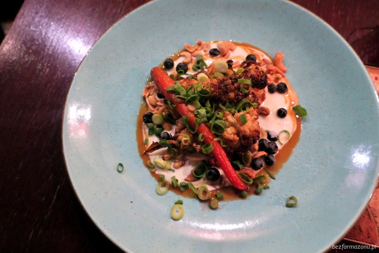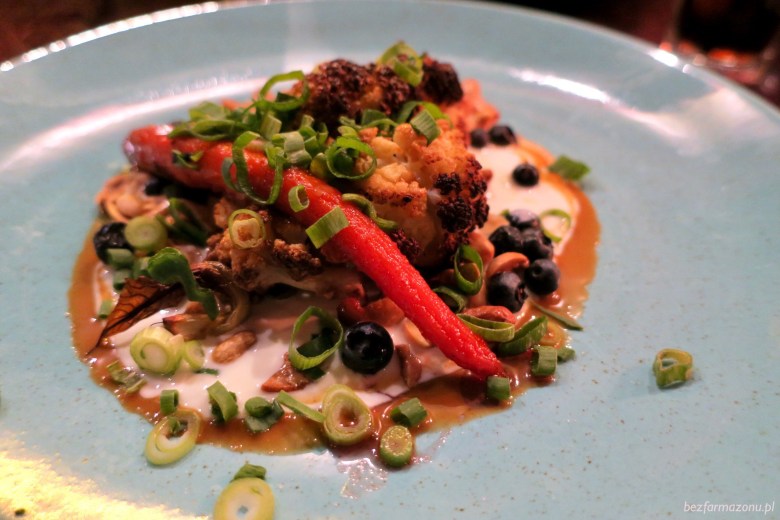 Młody kalafior tu i ówdzie mocniej przypieczony okazał się jednym z lepszych wegańskich dań tego roku. Kapustnemu wtórowały arachidowe orzechy (chociaż w menu widniały jako laskowe), sprężysta marchewka w miodzie, borówki, sos z prażonych orzechów ziemnych i jogurt cytrynowy. Przystawka iście wybitna, szczerze ją polecamy również mięsarianom.