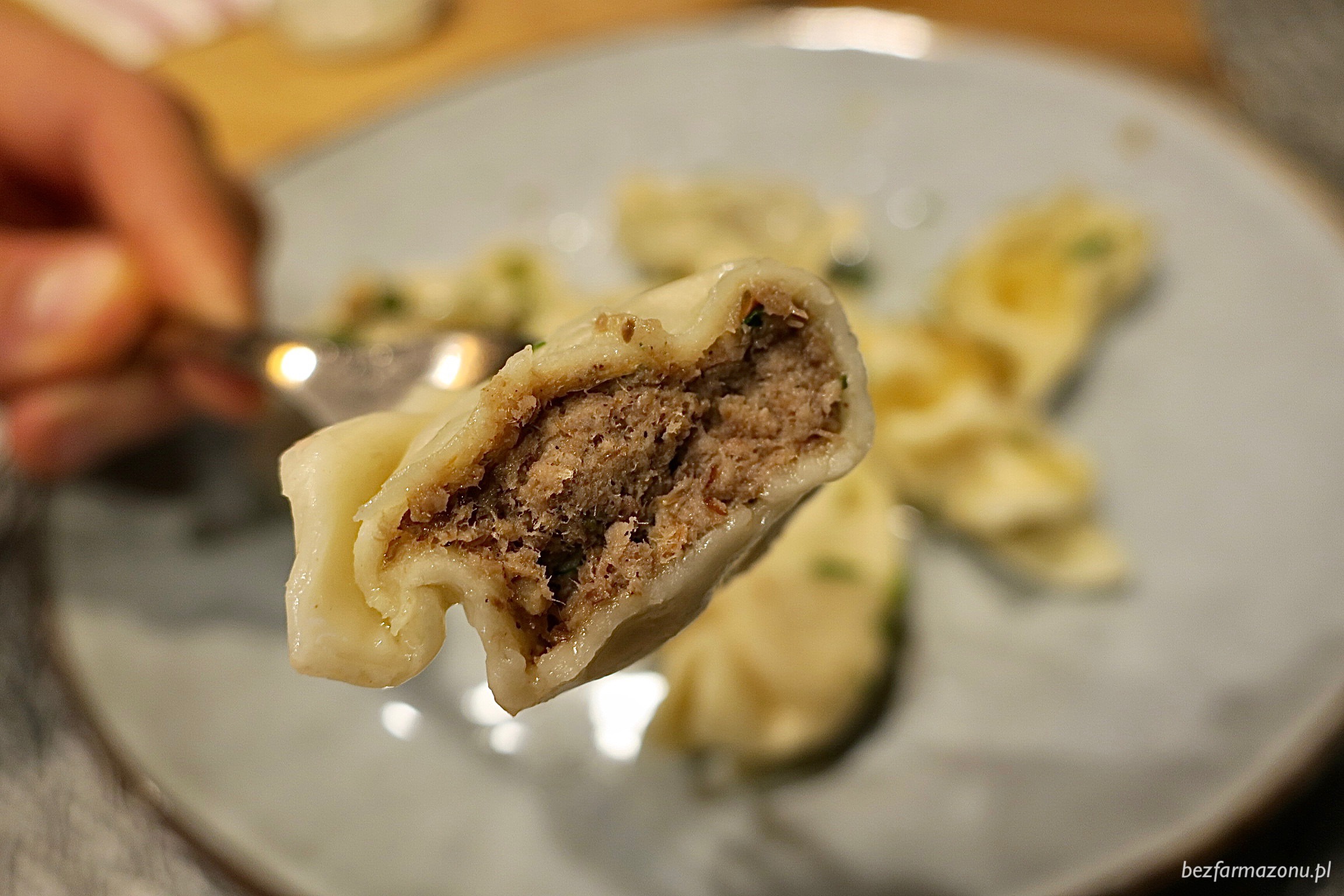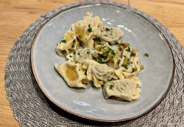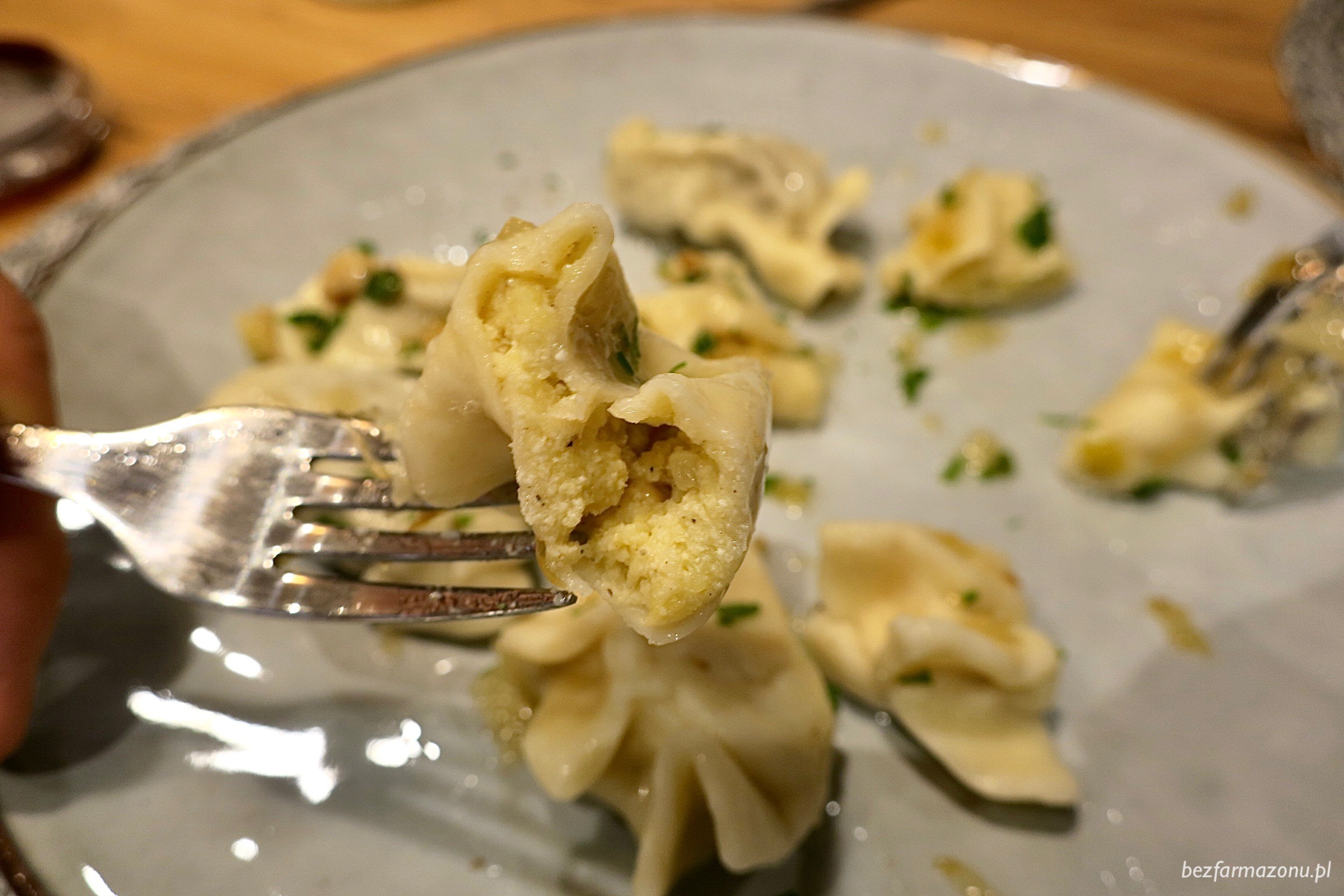 W ramach przystawki zamówiliśmy słynne pierogi pani Rysi: ruskie (17 PLN) i z mięsem, a konkretnie policzkami wołowymi z dodatkiem majeranku (19 PLN). Takich falbanek to ja nie widziałem chyba nigdy! I to aksamitne, cienkie ciasto! Ruskie smakowały ok, ale nie ukrywam że jadłem lepsze i ze zdecydowanie większą ilością farszu (pozdrawiam mamę). A mięsne? Kosmos! Nadzienie intensywnością treści i bogatym smakiem wołowiny rzuca na kolana. Pyszność.