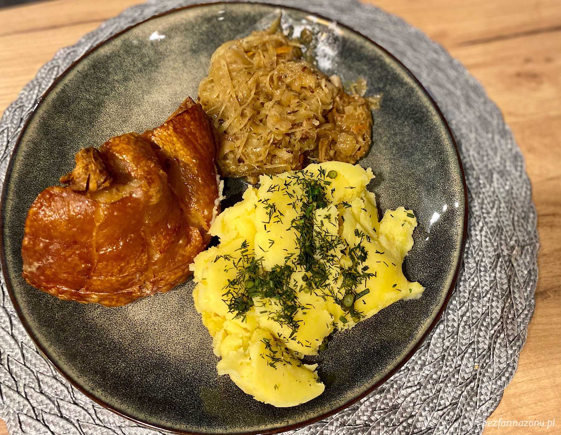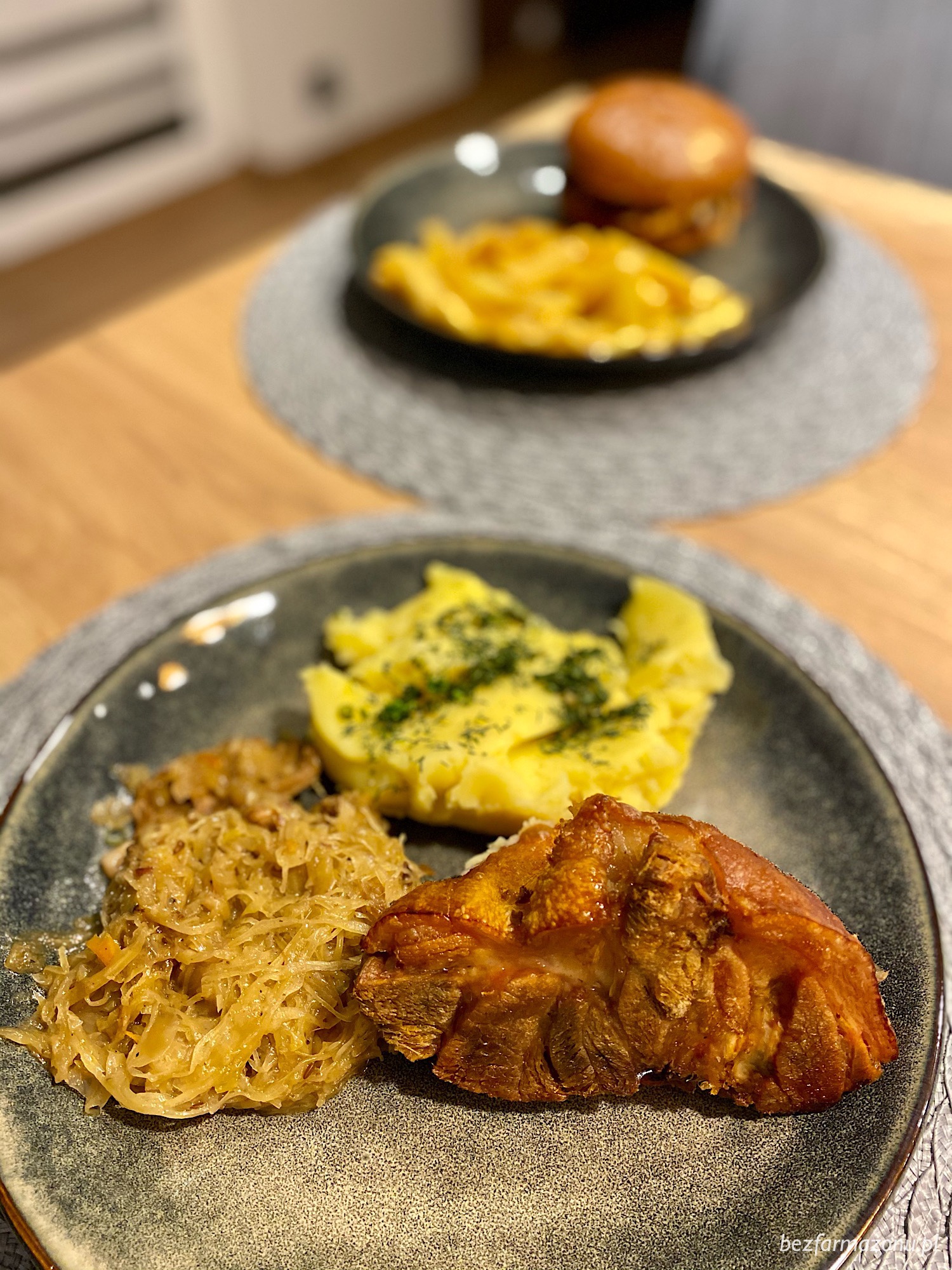 K. poprosiła o małą pieczoną golonkę z przefajną chrupiącą skórką (37 PLN). Do tego dania ciężkim grzechem byłoby podawanie innych towarzyszy aniżeli ziemniaki czy kapucha. Te pierwsze w formie puree, muśnięte masłem, zasmażana kapusta jak doskonały jarski bigos – z kawałkami grzybów, aromatyczna i upajająca – ciężko trafić na równie dobrą. Zaserwowane w zestawie chrzan oraz musztarda kremowe i o wyważonej mocy.