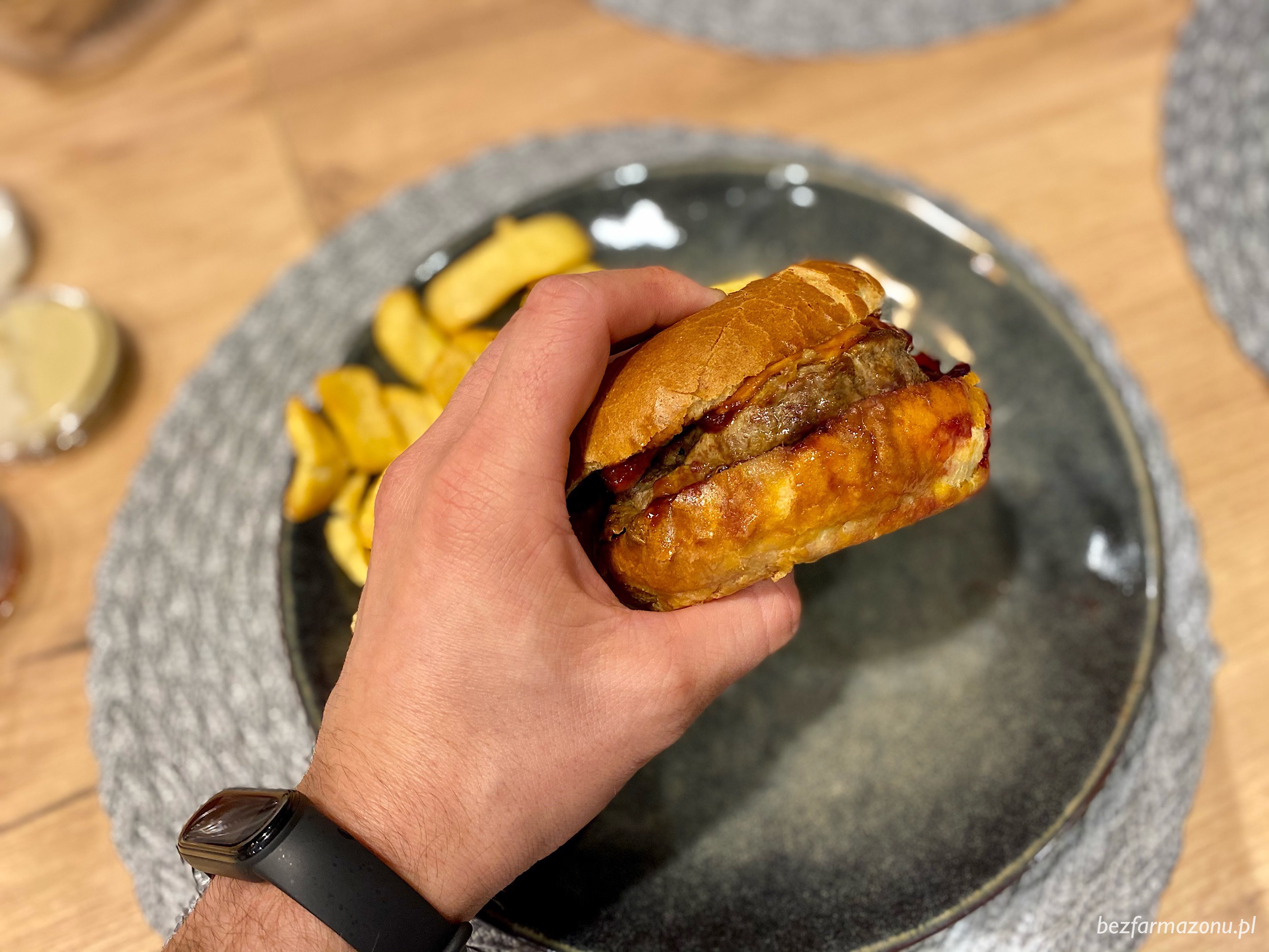 Wraz z burgerem serwuje się stekowe frytki. Ciężko stwierdzić czy chrupiące czy nie, gdyż po kilkudziesięciu minutach w opakowaniu, zdążyły się lekko podgotować – taki to już urok wynosowych fryt. Mimo iż mrożone gotowce, do ich smaku nie mam zastrzeżeń.