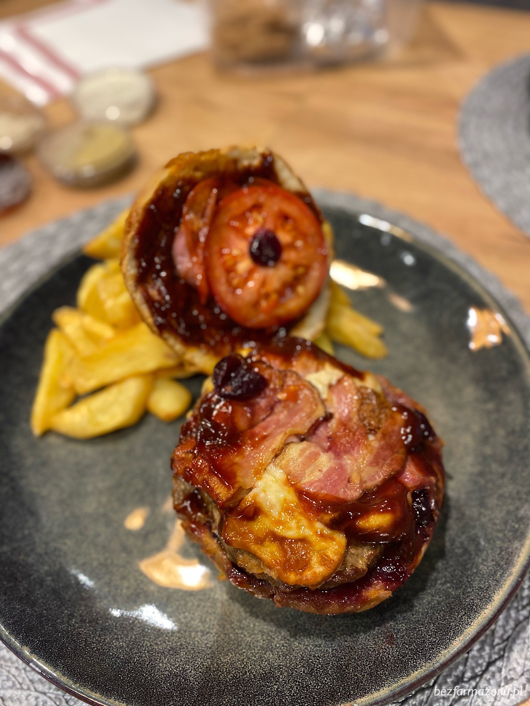 W ramach dania głównego złapałem ochotę na burgera w góralskim stylu (34 PLN). Jego góralskość implikowała ogromna ilość żurawiny z sosem bbq, dobrze wysmażone plastry boczku i grillowany oscypek. W smacznej maślanej bule zamknięto również marynowaną czerwoną cebulę oraz pomidora, który de facto mnie zaskoczył, bo nie występuje w menu jako składnik tego bugsa. Standardowo do środka pakuje się również rukolę, jednak za owo zielepactwo grzecznie przez telefon podziękowałem. Wołowy, dobrze doprawiony, gruby i rubaszny kotlet smakował mi, ale zdjąłbym go z grilla minutę wcześniej, gdyż wolę mięcho usmażone na medium, a nie well done.