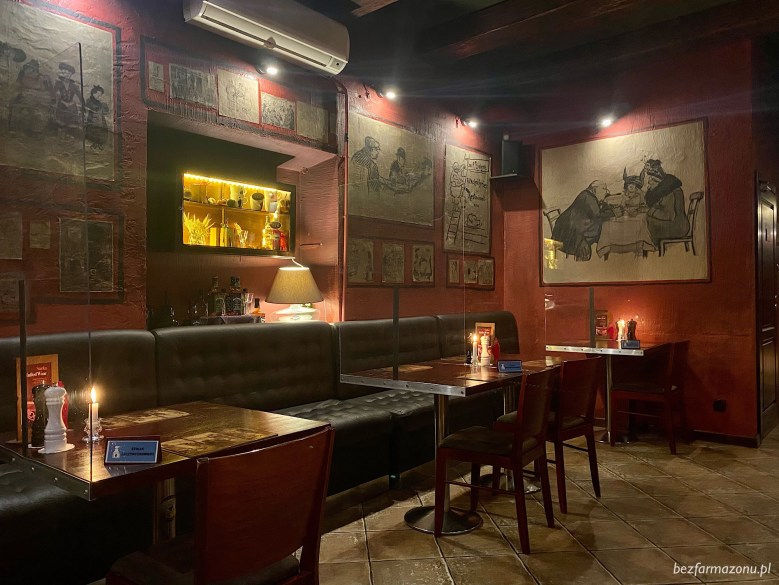 Wystrój relatywnie małego lokalu przywodzi na myśl międzywojenny Kazimierz z jakim spotkałem się w filmach. Wyeksponowany, uginający się od przeróżnych alkoholi bar, nietypowe zdobiące czerwone ściany uwypuklone przez subtelne oświetlenie ryciny, dwa razy w tygodniu muzyka na żywo (chociaż nie wiem czy w również w dobie korony). Ciepła i niemalże domowa atmosfera, nie zaznacie nadęcia i białych obrusów. Ową restaurację kochają turyści i kiedykolwiek tam w przeszłości nie byłem to słyszałem co najmniej dwa inne niż polski języki. W trakcie kolacji można się poczuć jak w innym państwie – tutaj przeglądają mapę, gdzieindziej się sobie przedstawiają, a jeszcze dalej niemiec z holendrem cisną „brudzia” 😉
