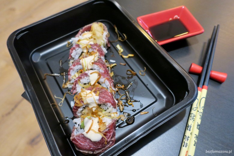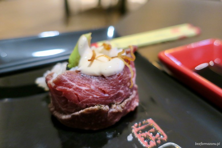 Zacznijmy od uramaków (60 PLN). W wersji mięsnej znajdziecie: wołowinę Wagyu (40g), krewetkę w tempurze, ogórek, serek kremowy, awokado, marchewkę, wasabi. Jeśli do tej pory nie próbowaliście tej niesamowicie delikatnej wołowiny bierzcie w ciemno!