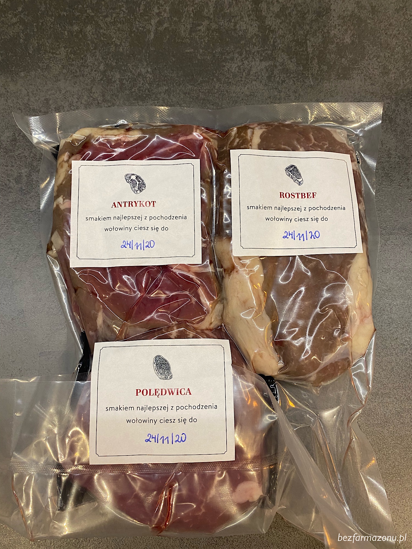 Pariliiada (110 PLN) wywołała na mej twarzy ogromny uśmiech. Cóż to takiego? 600 gram zapakowanego próżniowo mięsa w trzech klasycznych cięciach: od lewej rostbef, polędwica, antrykot.