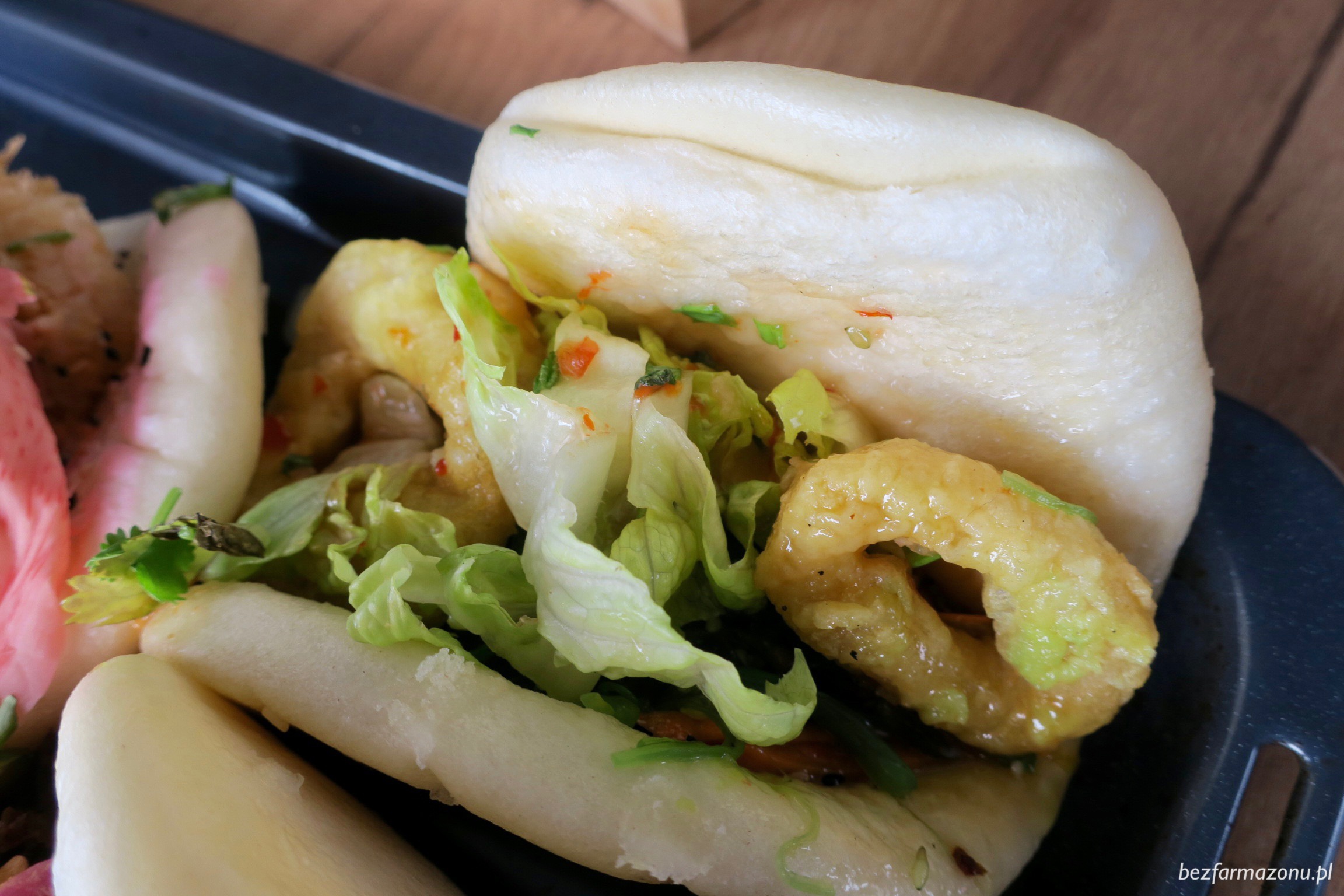 - bao z KALMAREM W TEMPURZE (15 PLN), sałatą, glonami wakame i sosem sweet chili skrywało dwie niegumiaste sztuki owoców morza, ale nie ma co się oszukiwać – tempura najlepiej smakuje tuż po zrobieniu. W moim przypadku przez czas transportu i sesję zdążyła wystygnąć, a po podgrzaniu straciła swoją sprężystość. Bierzcie tą zapewne smaczną bułkę w lokalu, w dowozie jednak odradzam.
