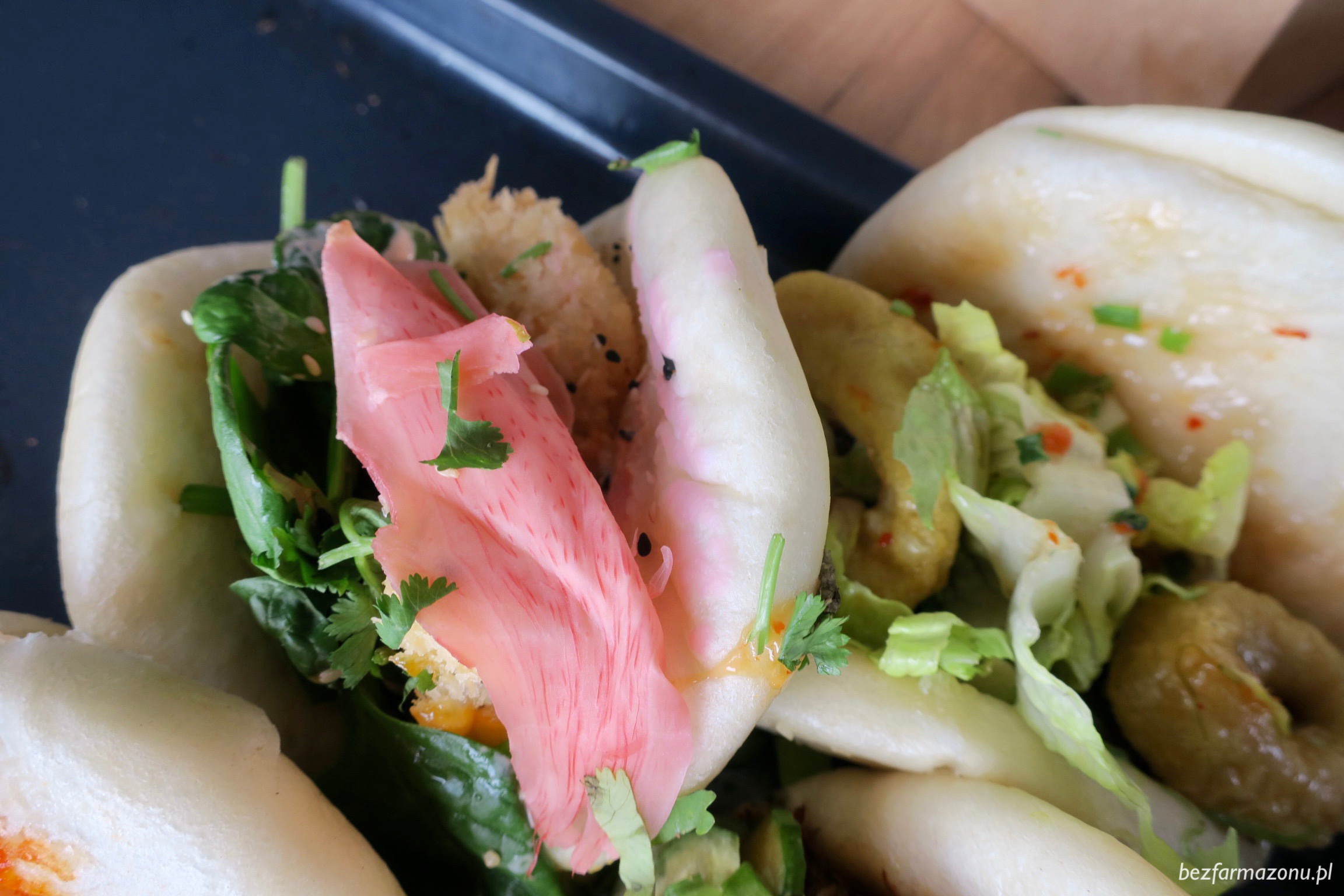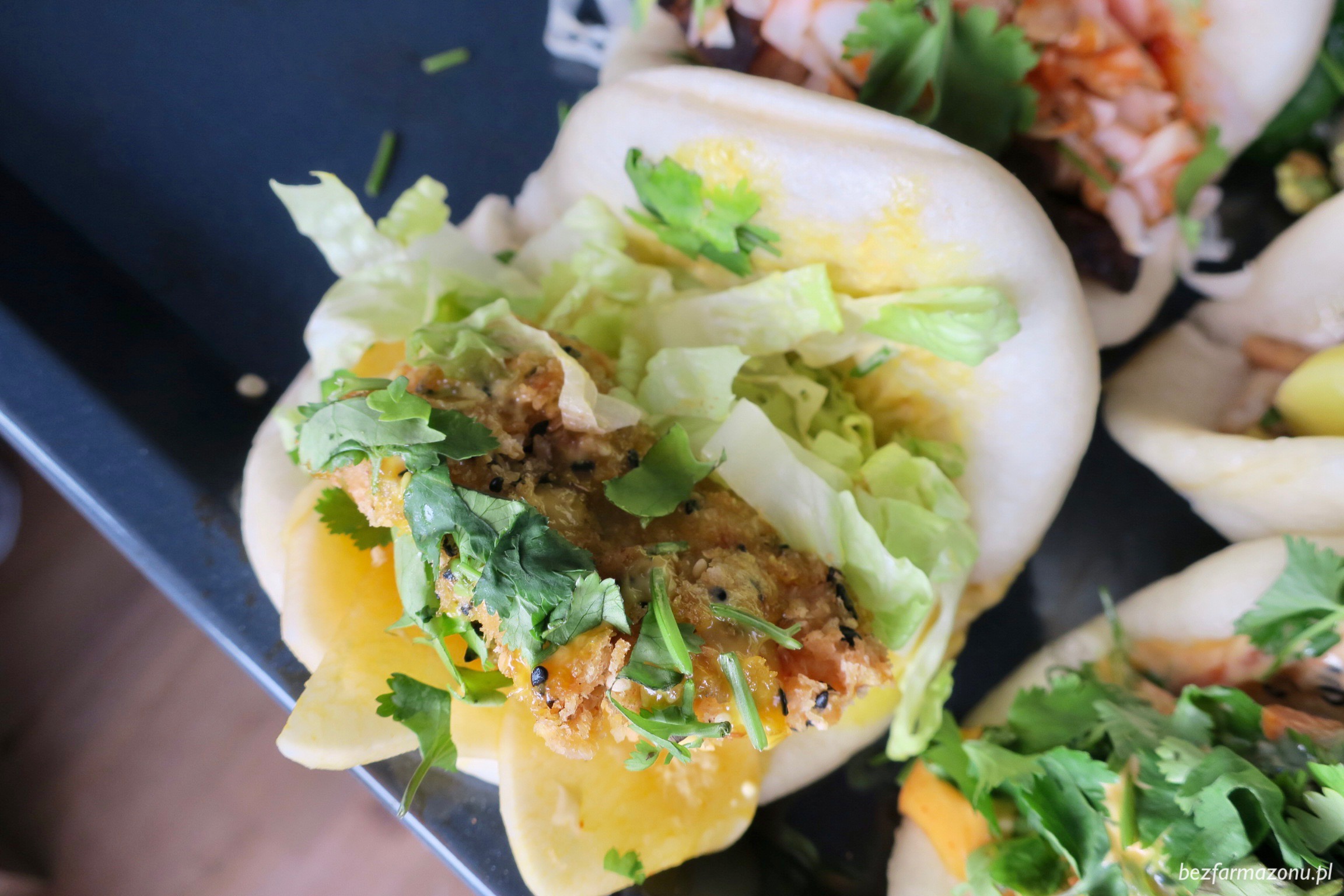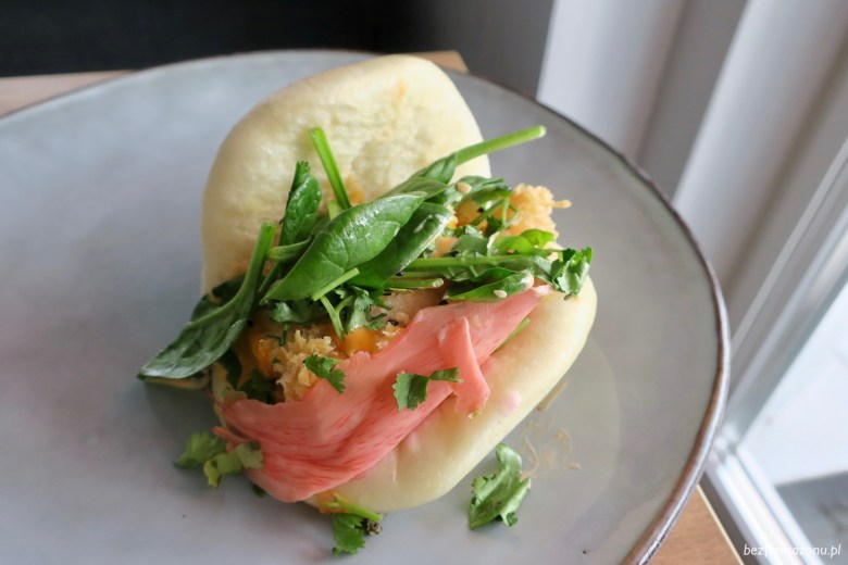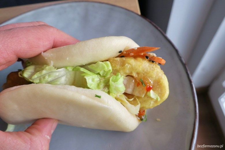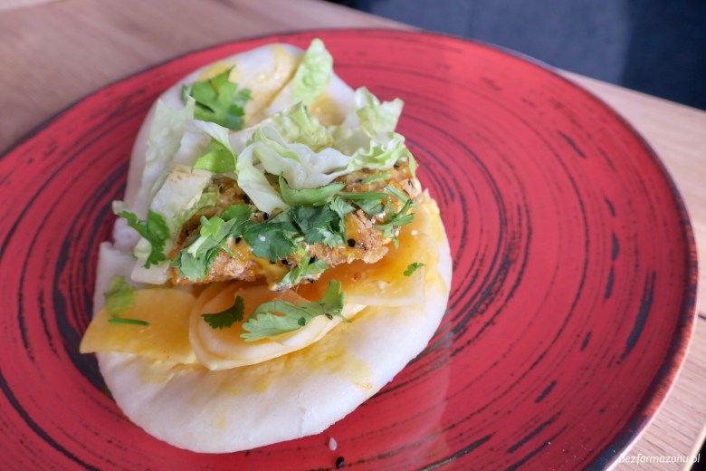 - bao z panierowanym ŁOSOSIEM (16 PLN) rzodkwią w cytrusach, kolendrą i mango mayo to świeżynka w bao’wej karcie. W tej mięciutkiej bułeczce ta panierowana ryba nie do końca trafiła w moje gusta.