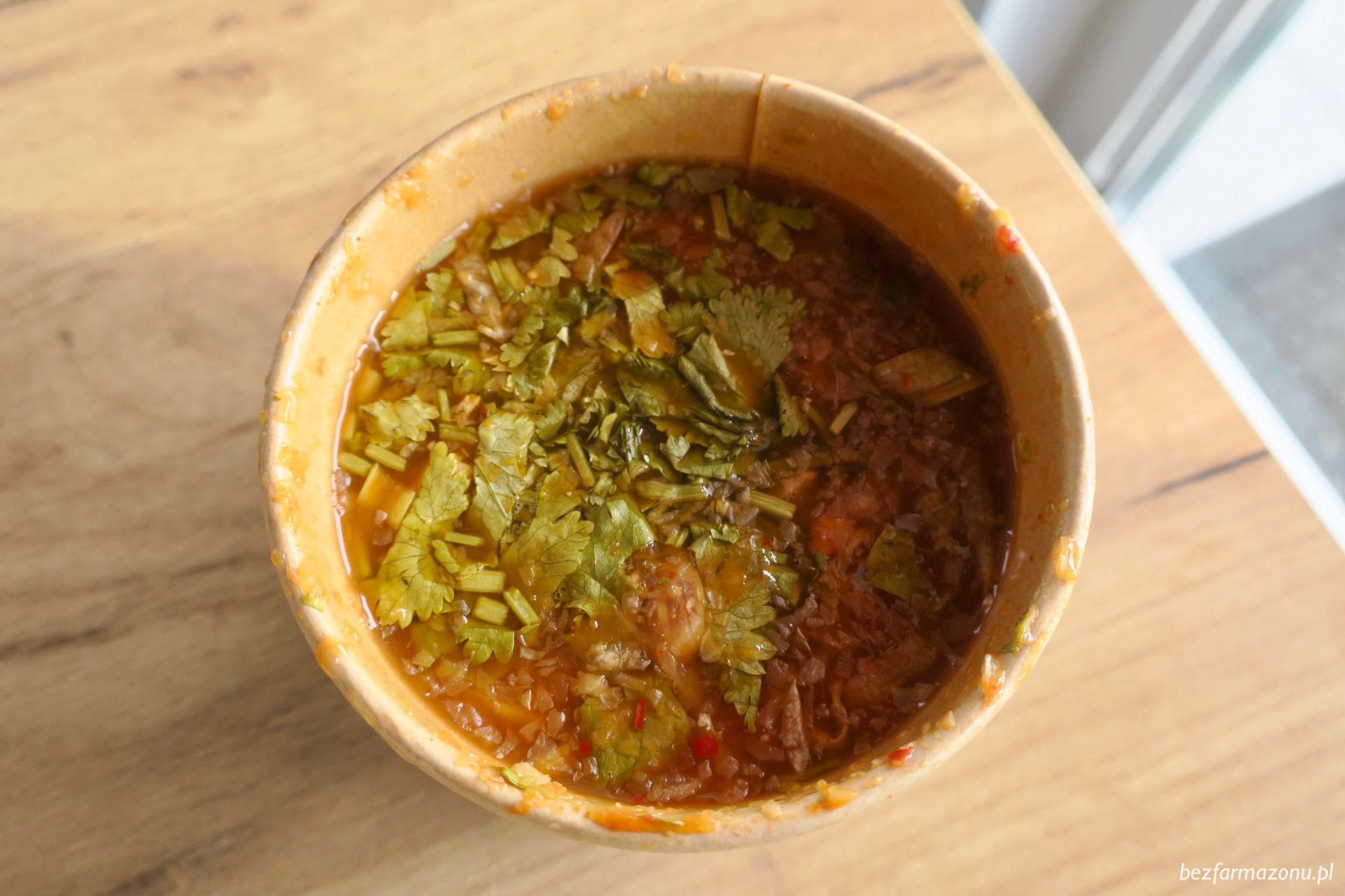 Przed przyjściem męskiej ekipy zdążyłem podelektować się chrupiącymi frytkami z batatów (13 PLN) oraz charakterną, pikantną, treściwą, zupą kimchi z kilkoma kawałkami kurczaka (15 PLN).