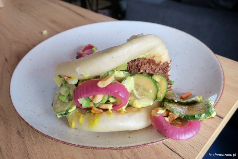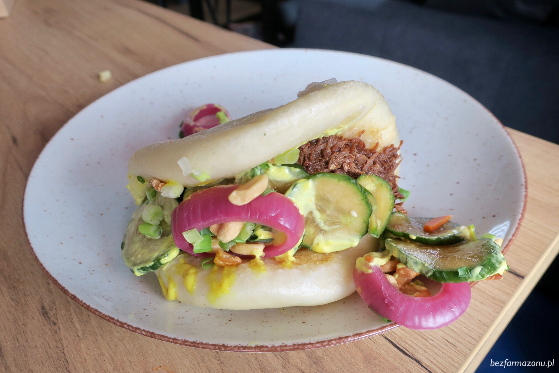 - bao z soczystą i przyjemną DUSZONĄ jakby szarpaną WOŁOWINĄ (15 PLN), piklowaną cebulą i orzeszkami ziemnymi gdyby nie sos curry oraz ogórek z imbirem smakowałoby niemalże tak obiadowo i po polsku. Mimo iż mało azjatycka, to na pewno ciekawa opcja.