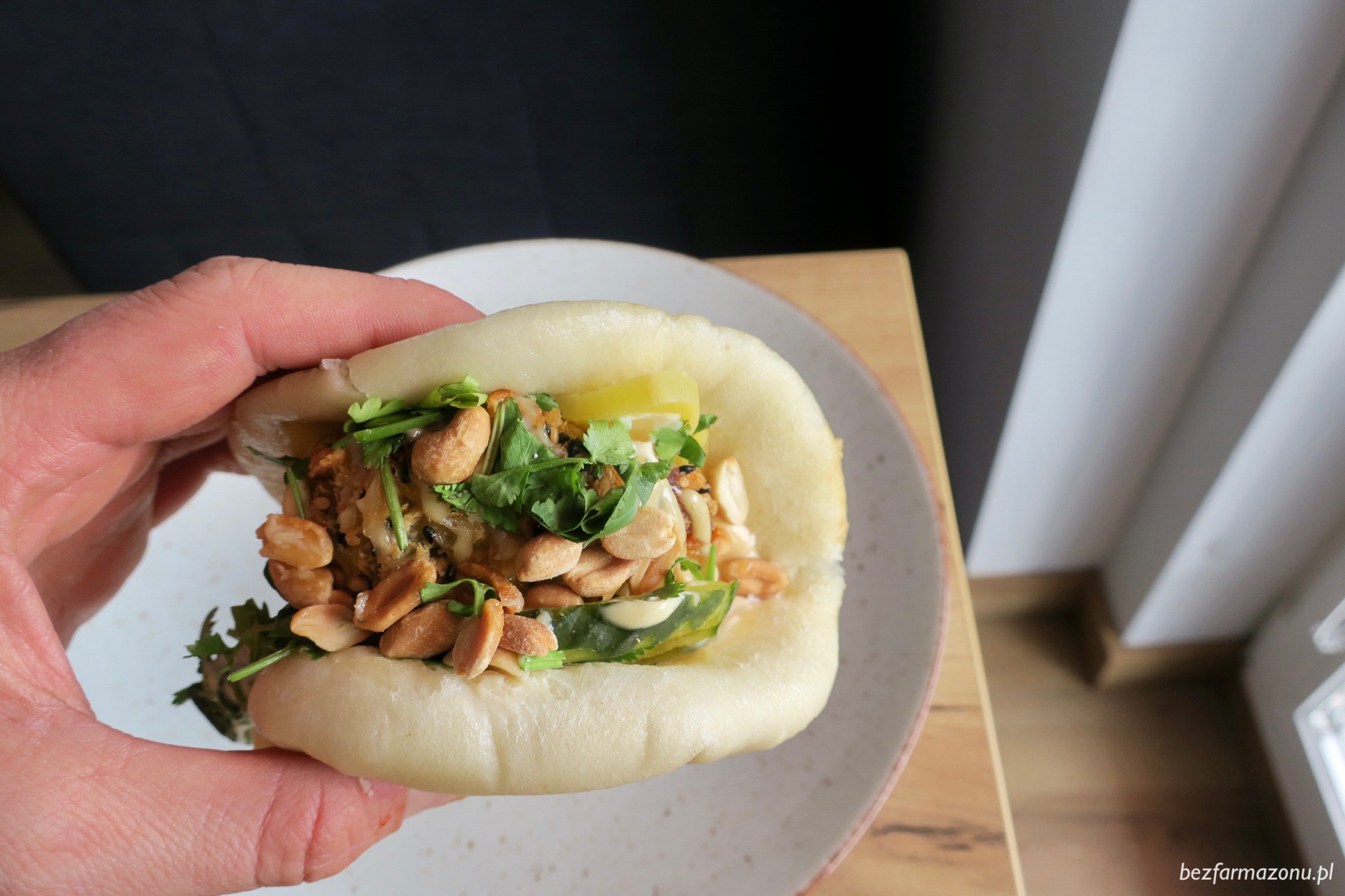 - a na koniec pure VEGE mianowicie bao z NUGGETSAMI SOJOWYMI (15 PLN), piklowanym ogórkiem, rzodkiewką i orzeszkami ziemnymi. Przez ogromną ilość kolendry oczywiście wziąłem jego tego bułka za wroga, jednak po odrzuceniu mydlastego zielska, kotlet z bobowatej rośliny w połączeniu z miso mayo zdobył moją aprobatę.