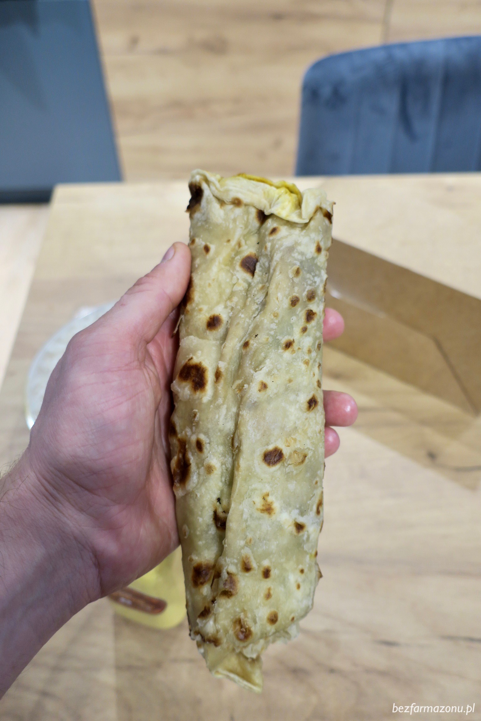 • The Masala Butter Chicken Roll (19 PLN) zaskoczył ciężarem i wielkością. W środku wypiekanego na miejscu pieczywa (chlebka kathi) obok zielonej papryki kryje się sporo soczystych kawałków kurczaka w maślano – pomidorowym sosie. Roll jest aromatyczny, ale nie do przesady. Bardzo, ale to bardzo mi i moim ziomalom posmakował.