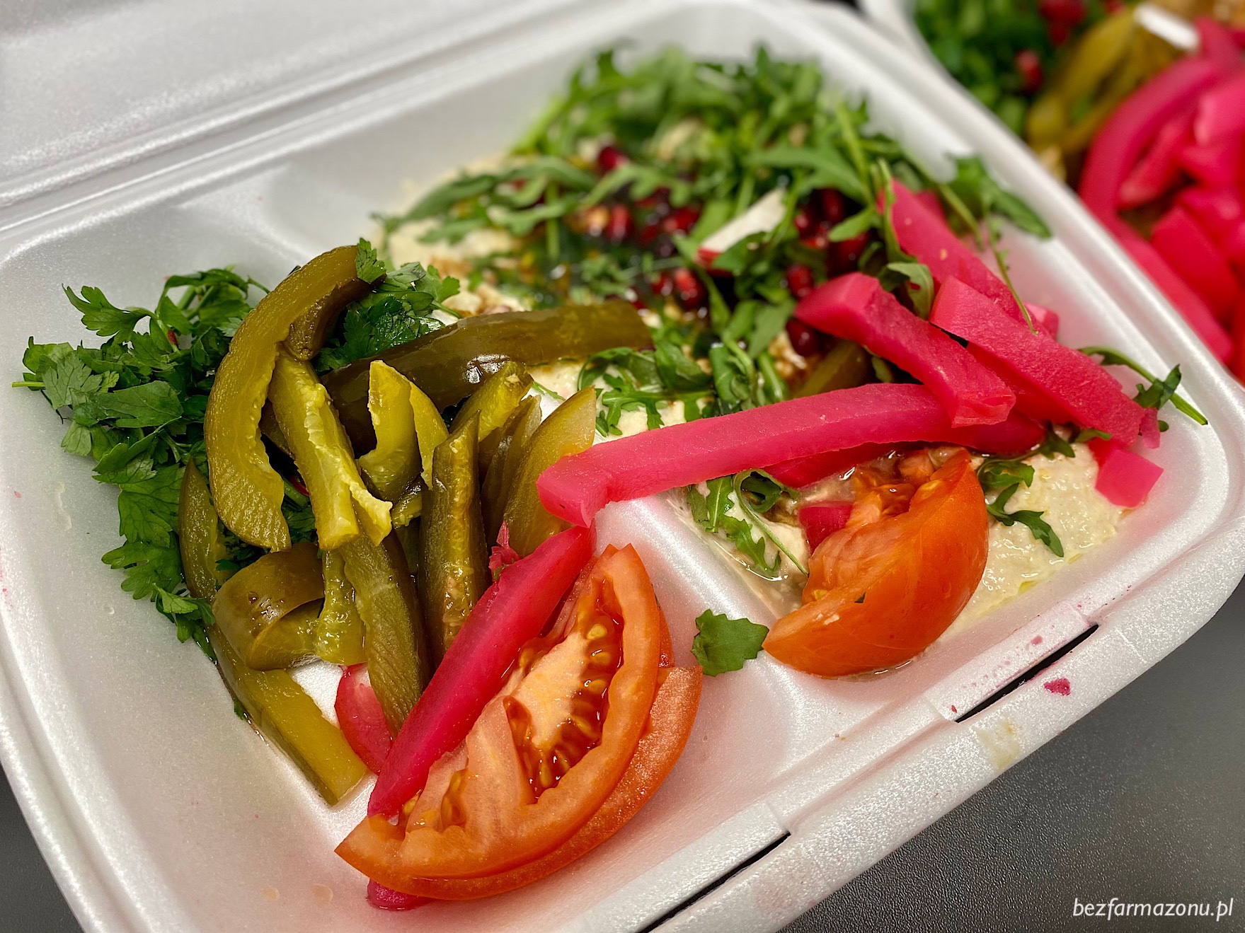 Wspólnym mianownikiem wszystkich dań była ogromna ilość zieleniny i szalenie zakwaszone (tak ponad granice wytrzymałości naszej trójki) ogórki oraz rzepa. Na plus zaliczyliśmy domową pitę oraz wyborny, kremowy hummus.