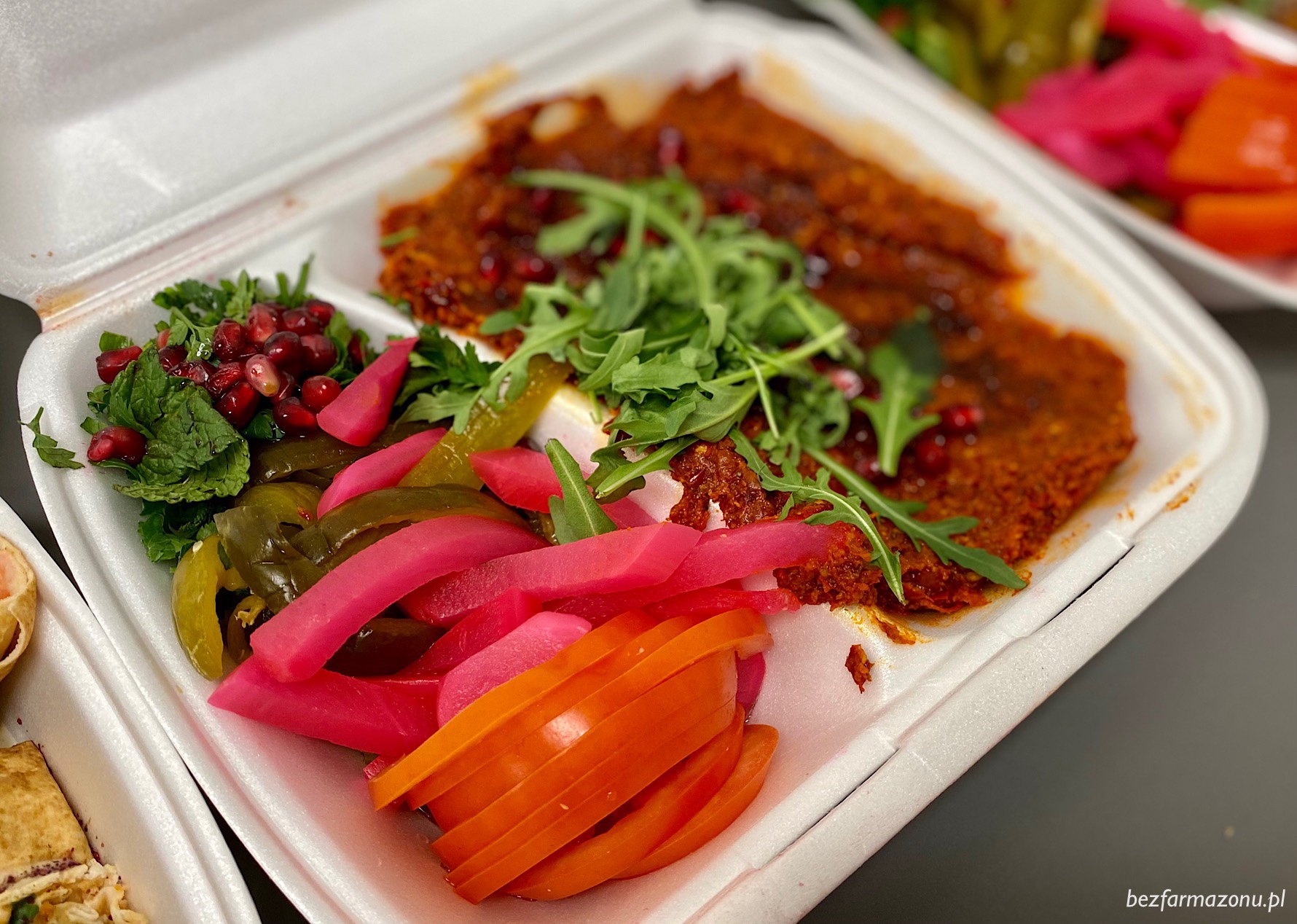 - w kolejnym styropianie znajdowała się Muhammara (15 PLN) – mocno pikantna i trochę gorzka pasta z papryki, orzechów włoskich i cebuli. O kurcze, to również kompletnie nie moja bajka.