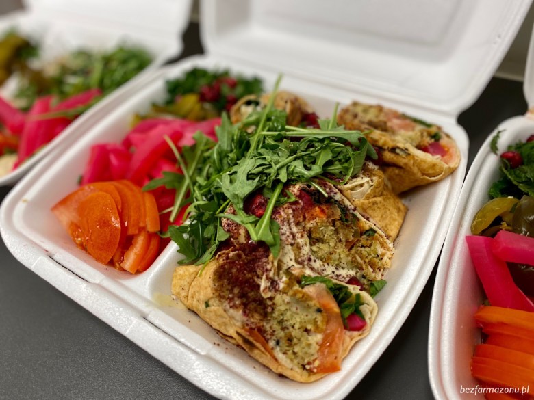 - MF sandwicz duży (13. PLN) z dwoma sztukami falafela, tahiną, bakłażanem i granatem. Doskonałe wywarzenie składników, wielkość idealna na lunch. Pyszności – normalnie pyszności.