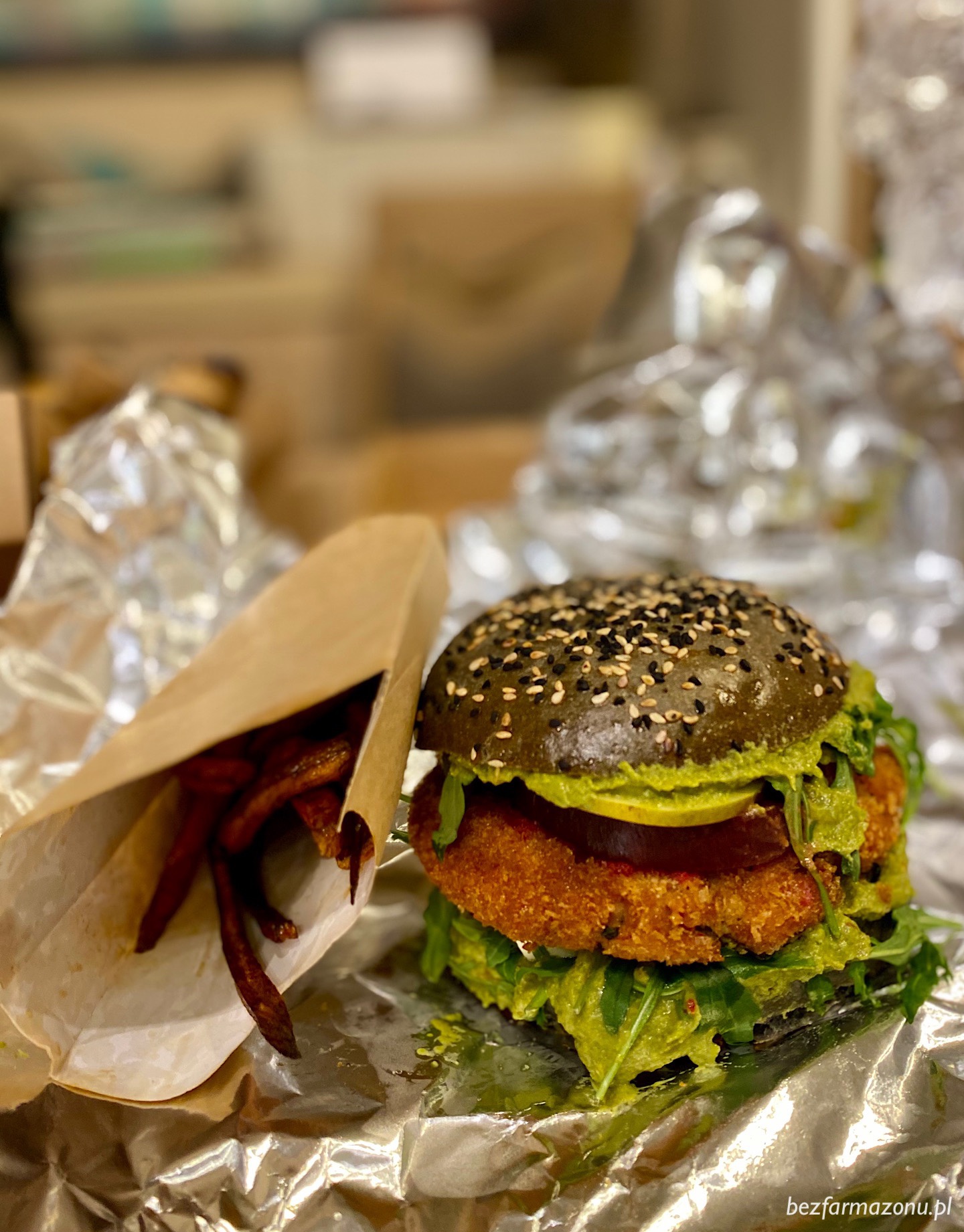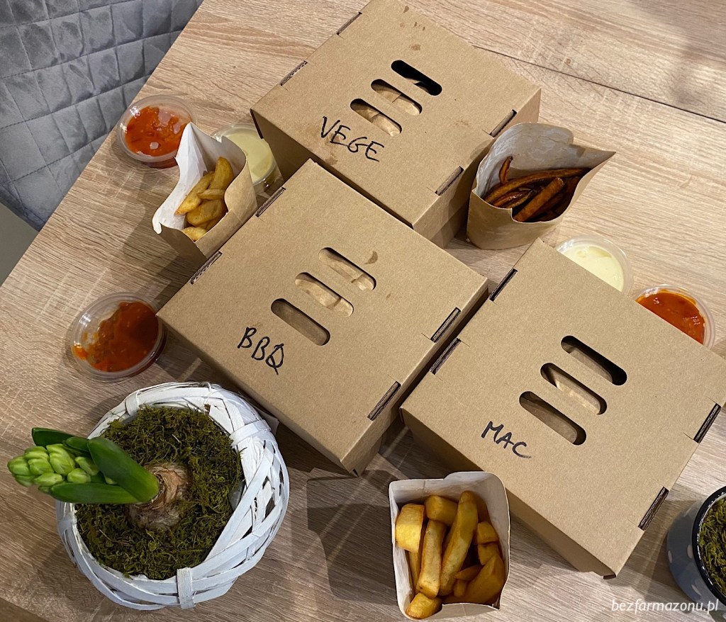 Z bardzo szerokiego menu wybraliśmy trzy burgery: dwa pełnoprawne wołowe i jednego roślinnego. Dojechały gorące, bo owija się je papierem którego wewnętrzna strona wyścielona jest folią. Tak zapakowane wkłada się do boxa. I teraz uwaga – dzieje się magia. Owego boxa otwieracie ot tak normalnie do góry jak najzwyklejsze na świecie pudełko, a to rozkłada się tworząc coś jakby podstawkę – talerzyk. W tej kwestii ocena celująca.