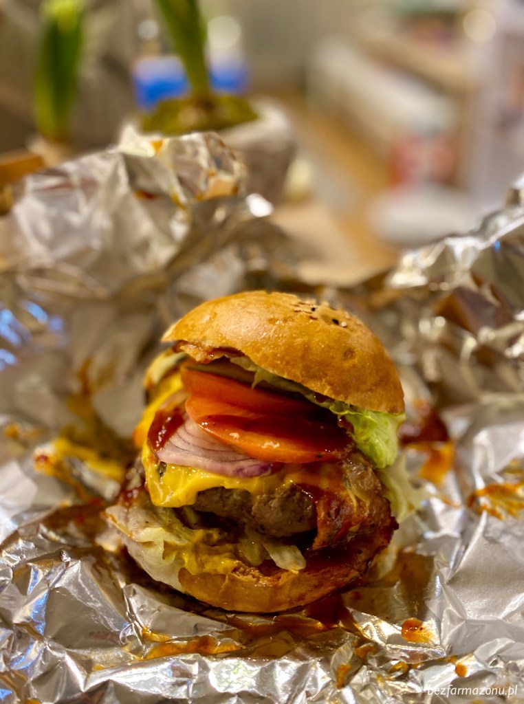 • BBQ (28 PLN) – wołowina 200g / bekon/ sałata / ogórek konserwowy / cebula / pomidor / cheddar / sos BBQ / musztarda