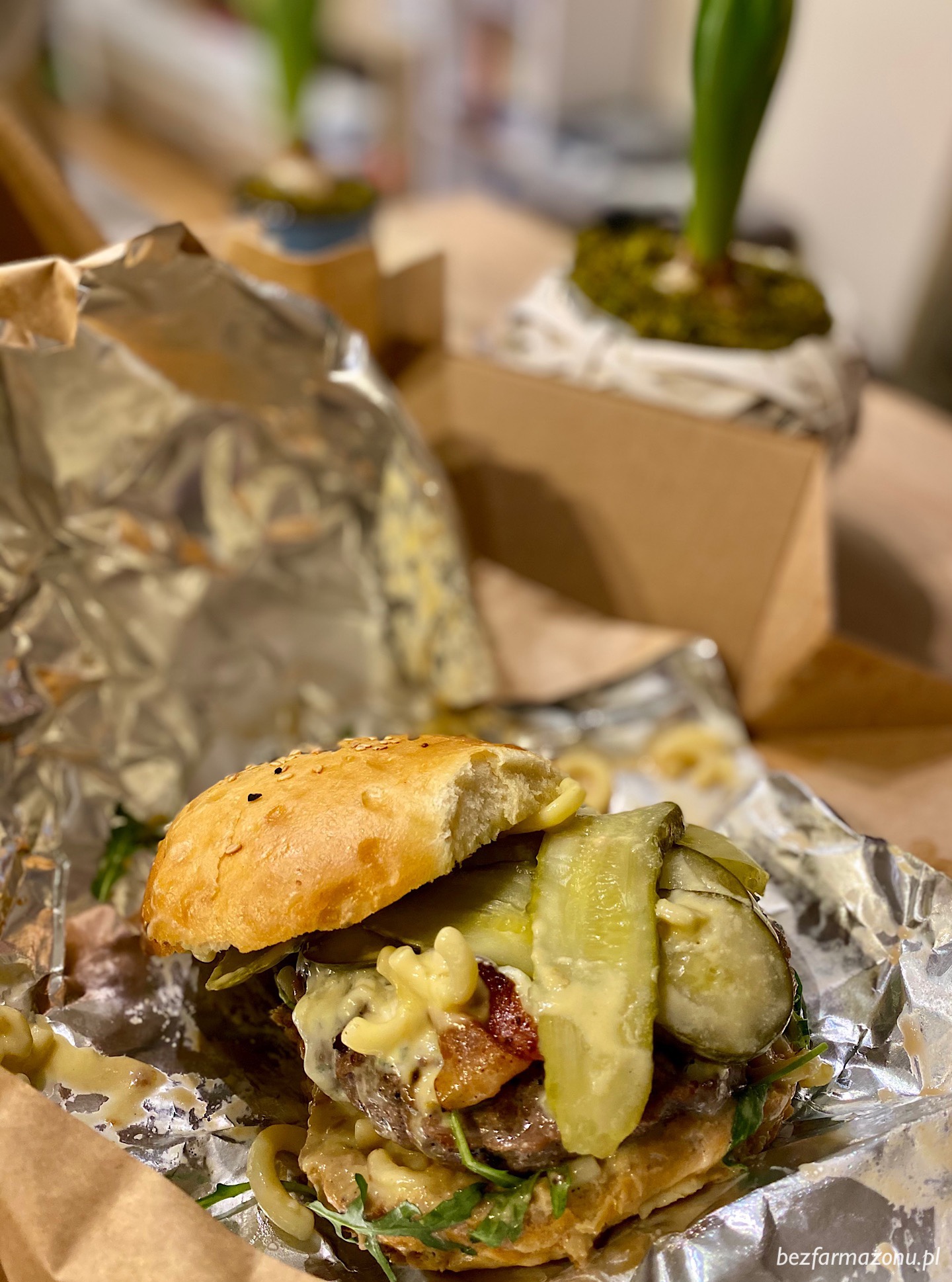 Dwa mięsne burgery spełniły pokładane w nich nadzieje. Nakarmiły nas do pełna i ze smakiem. Polubiliśmy zarówno buły jak i mięsa, chociaż nie byłbym sobą gdybym się nie przyczepił do nazbyt mocno wysmażonego mięsa (wciąż całe jednak szczęście soczystego). Pochwaliliśmy również sosy i dodatki. A skoro o dodatkach mowa to nie mogę nie wspomnieć że kombinacji sera z makaronem w moim burgerze to strzał w dziesiątkę! Oczywiście, że wolałbym w nim własnej roboty odrobinę pikantniejsze pikle, ale już nie będę się czepiał szczegółów 😉