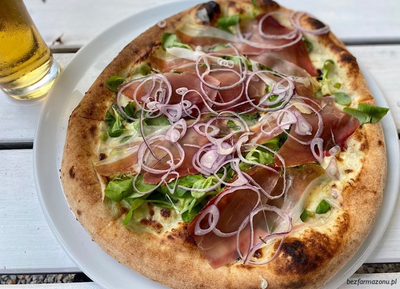 Początkiem czerwca w trakcie długiego spaceru z ziomkiem D. w ramach dwudziestominutowego przystanku zaserwowaliśmy sobie po browarze. Mi brakowało węgli więc poprosiłem również o sezonową pizzę na serowym sosie ze szparagami, mozzarellą fior di latte, czerwoną cebulą, roszponką i szynką parmeńską (30 PLN).