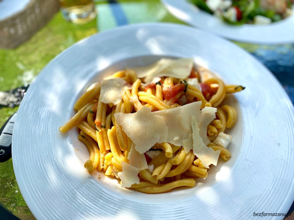 Drugim daniem był makaron strozzapreti z malinowym pomidorem, mozzarellą, szalotką i parmezanem (28 PLN). Na talerzu nie wygląda wybitnie, ale uwierzcie mi – ugotowana w punkt ogromna porcja węglowodanów posiliłaby nawet konia! Smakowo również bardzo okey – prosto i aromatycznie.