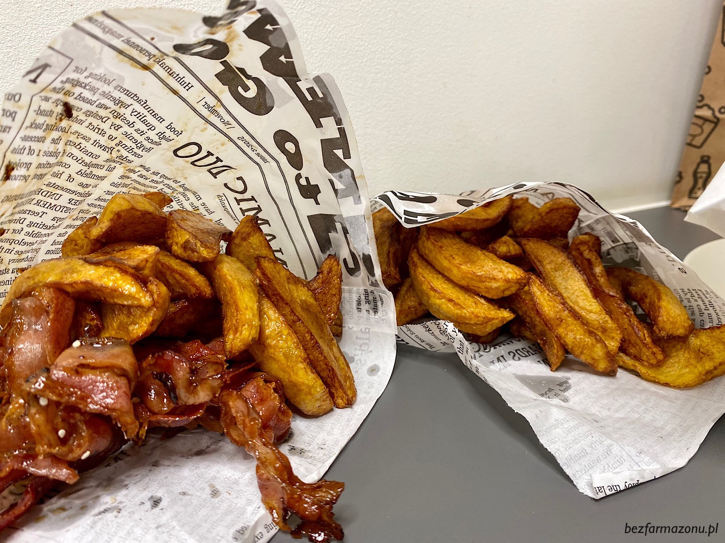 Te z bekonem również przednie chociaż ja podawałbym je nie w torebce, a tekturowym pudełku, a ten doskonały, chrupiący boczek pokruszył po wierzchu i polał odrobiną stopionego Cheddara. Ot taka wysokokaloryczna zachcianka.