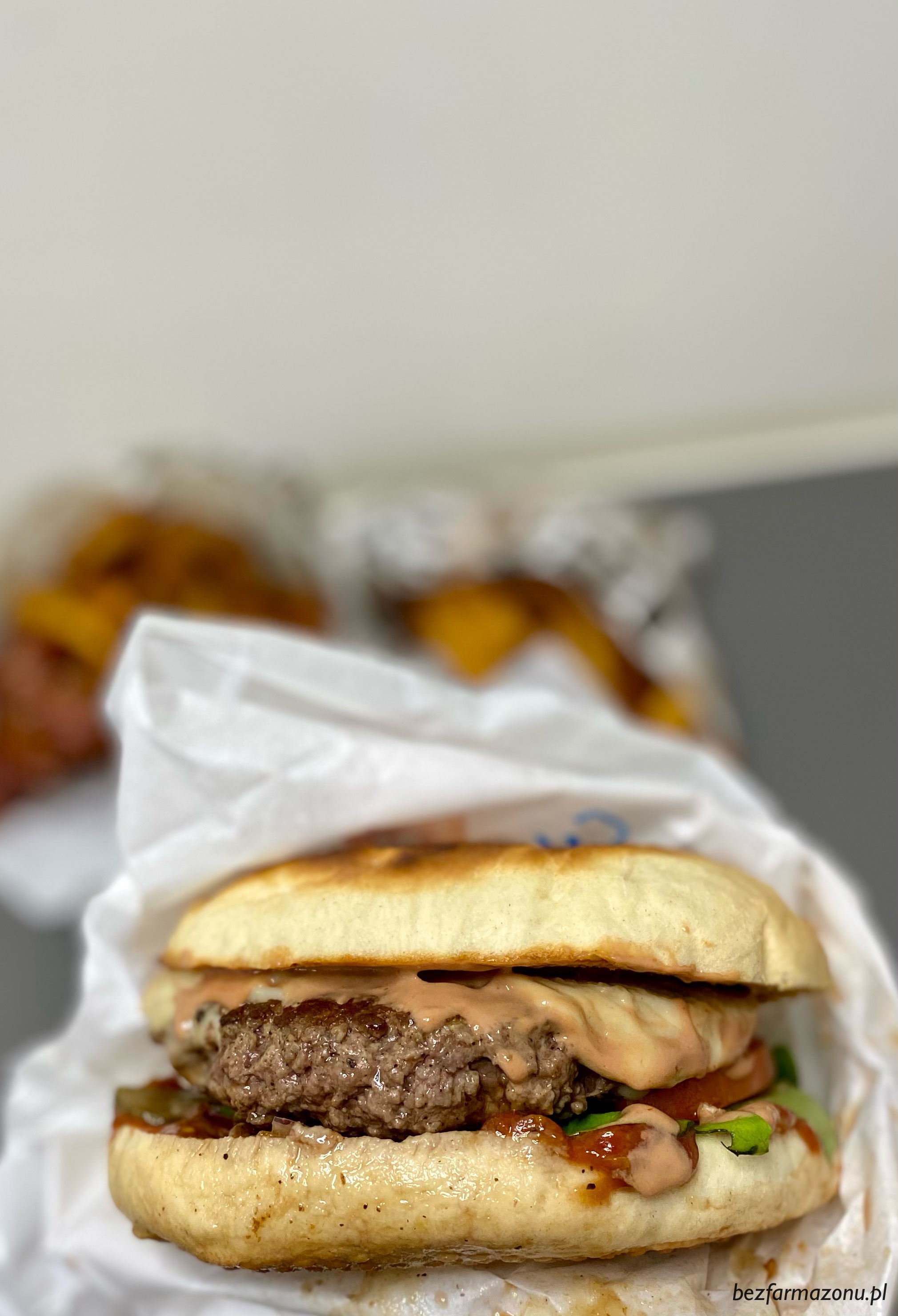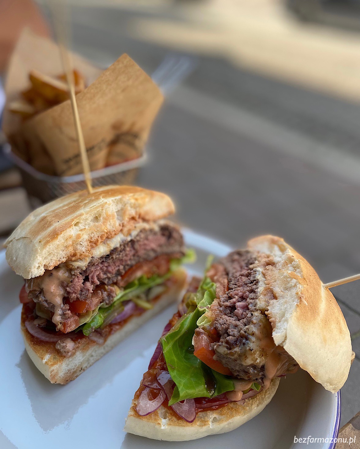 W lipcu 2021 w przerwie w pracy zajechaliśmy z D. na dwa burgery: klasyk (20 PLN) i cheese (22 PLN) oraz frytki (10 PLN) do podziału.