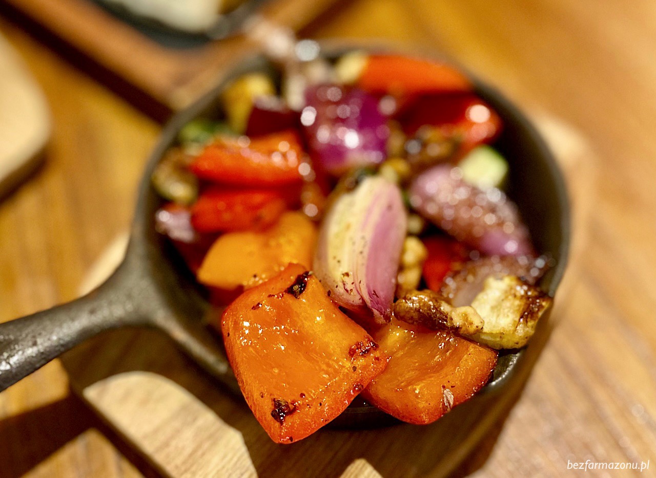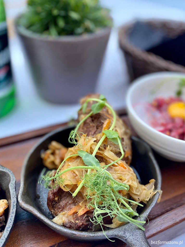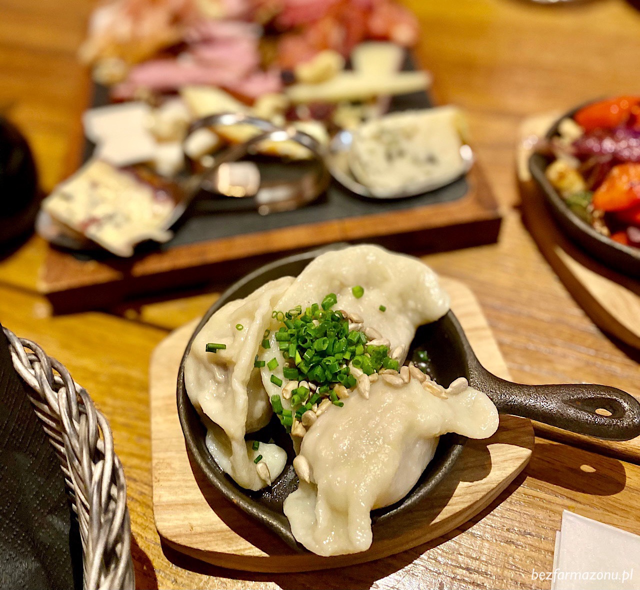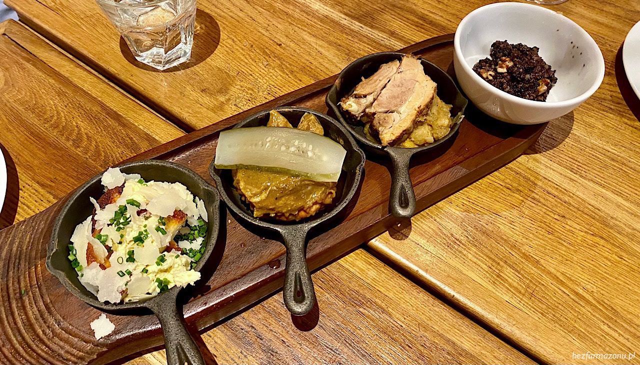 Wraz z deską pojawiły się przeróżne tapasy za 16 PLN każdy: maczanka po krakowsku, pierogi z kaczką, szczypiorkiem i słonecznikiem, grillowane warzywa, pieczone żebro z kapustą charsznicką oraz mini porcja kaszanki z podstolic (opisana kilka akapitów niżej) za 8 złotych.