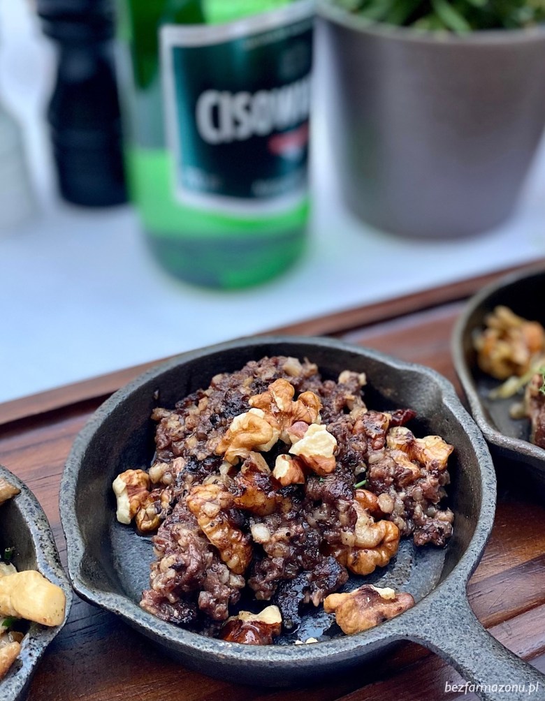 Kaszankę z Podstolic o wyraźnym smaku podrobów, ale również i kaszy jęczmiennej zestawiono z orzechami włoskimi (9 PLN). Tak dobrze czytacie, z orzechami! Ja owemu pomysłowi wtóruję i brawa biję, albowiem idea to świetna i owacji warta.