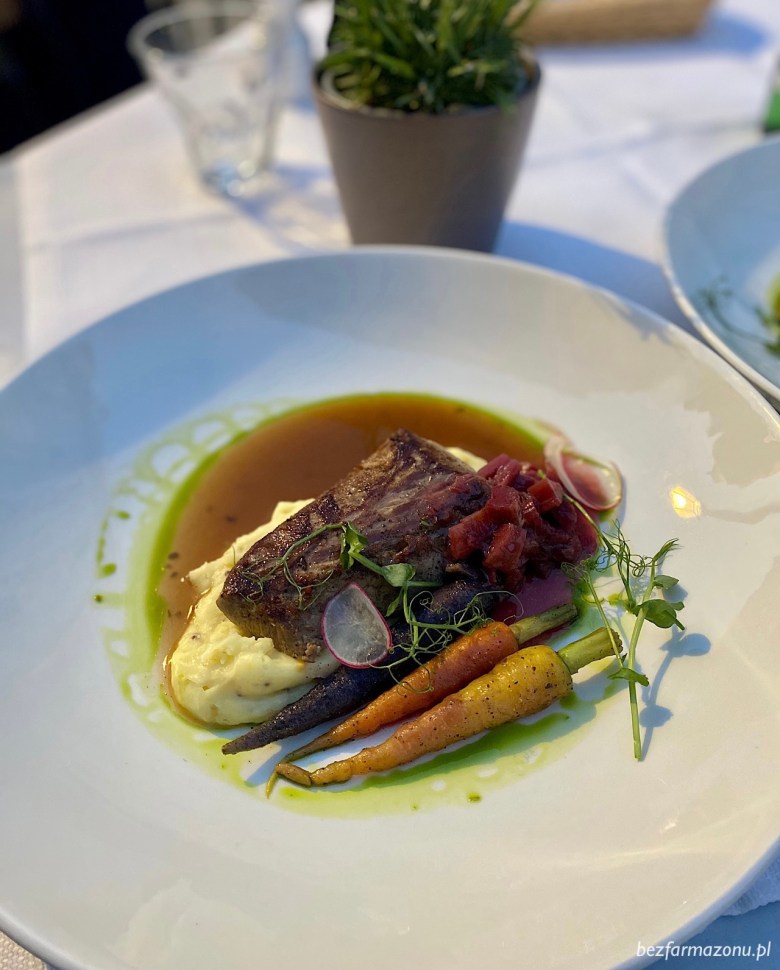 Polędwiczka wieprzowa na ziemniaczanym puree z francuską musztardą dosłownie kipiała soczystością (48 PLN). Wzorowym dodatkiem były trzy przygotowane „al dente” marchewki oraz lekko kwaskowaty chutney z rabarbaru. Maczanie mięsa i kremowych ziemniaków w ciemnym pieprzowym sosie kreśliło wejście do kulinarnych niebios. Danie bezbłędne.