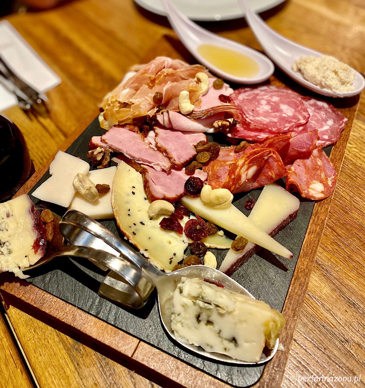 Na rozkręcenie apetytu z takowego menu poprosiliśmy o duże deski regonialnych szynek i serów (każda za 52 PLN). Obydwie zmieszczono jednak na powiedziałbym jednej średniej. Patrząc przez pryzmat stu złotych, porcje były mówiąc kolokwialnie takie sobie. Jakość również nas nie powaliła, niektóre sery nosiły ślady starości – ogólnie deskę przygotowano bardzo niestarannie. Widziałem na Rynku sporo lepsze (i tańsze) – np tutaj.