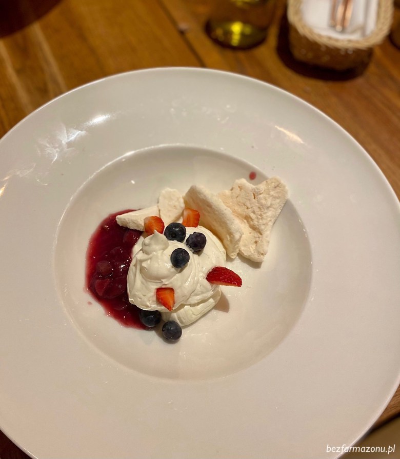 Wieczór zakończyliśmy jedynym! w karcie deserem – słodkim kremem chantilly z białej czekolady z kwaśną konfiturą z rabarbaru oraz bezą i owocami (26 PLN).