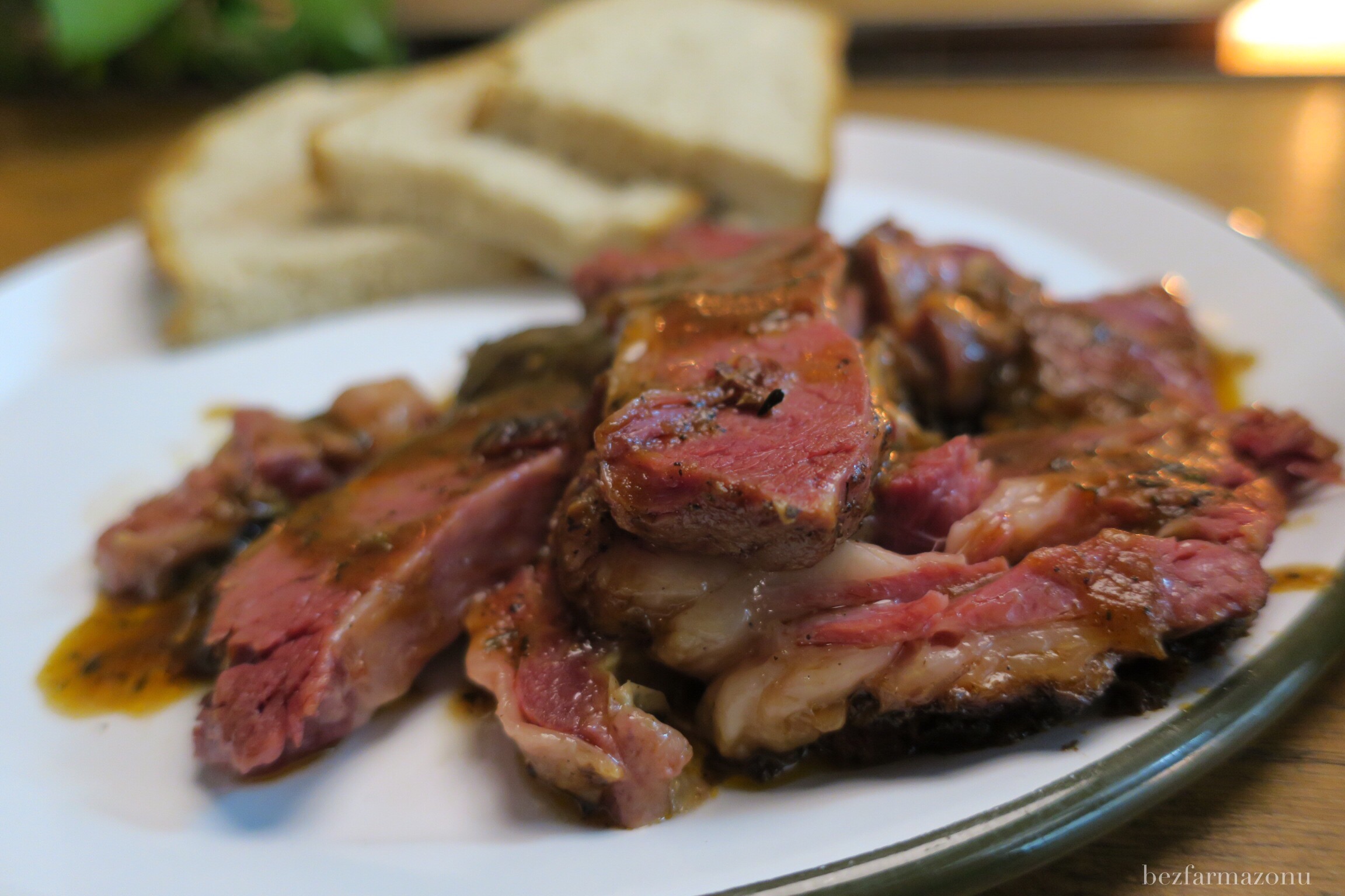 - duszonych w czerwonym wini żeberek wołowych (28 PLN). Mięso super miękkie, mega delikatne i dobrze przyprawione, ale co najmniej 1/3 z 300g porcji to tłuszcz i skórki. Faszerowane kiszoną kapustą papryczki i ogórki stanowiły pomysłowy i smaczny dodatek. Pszenno – żytni chleb doskonale wchłaniał aromatyczne, winno-mięsne sosy. W Meat & Go wycieranie talerza pieczywem do ostatniej kropli nie jest faux pais – jest nawet wskazane! Mimo wszystkich plusów kolejny raz nie zamówiłbym tej pozycji – jak dla mnie za dużo pobocznego sadła.