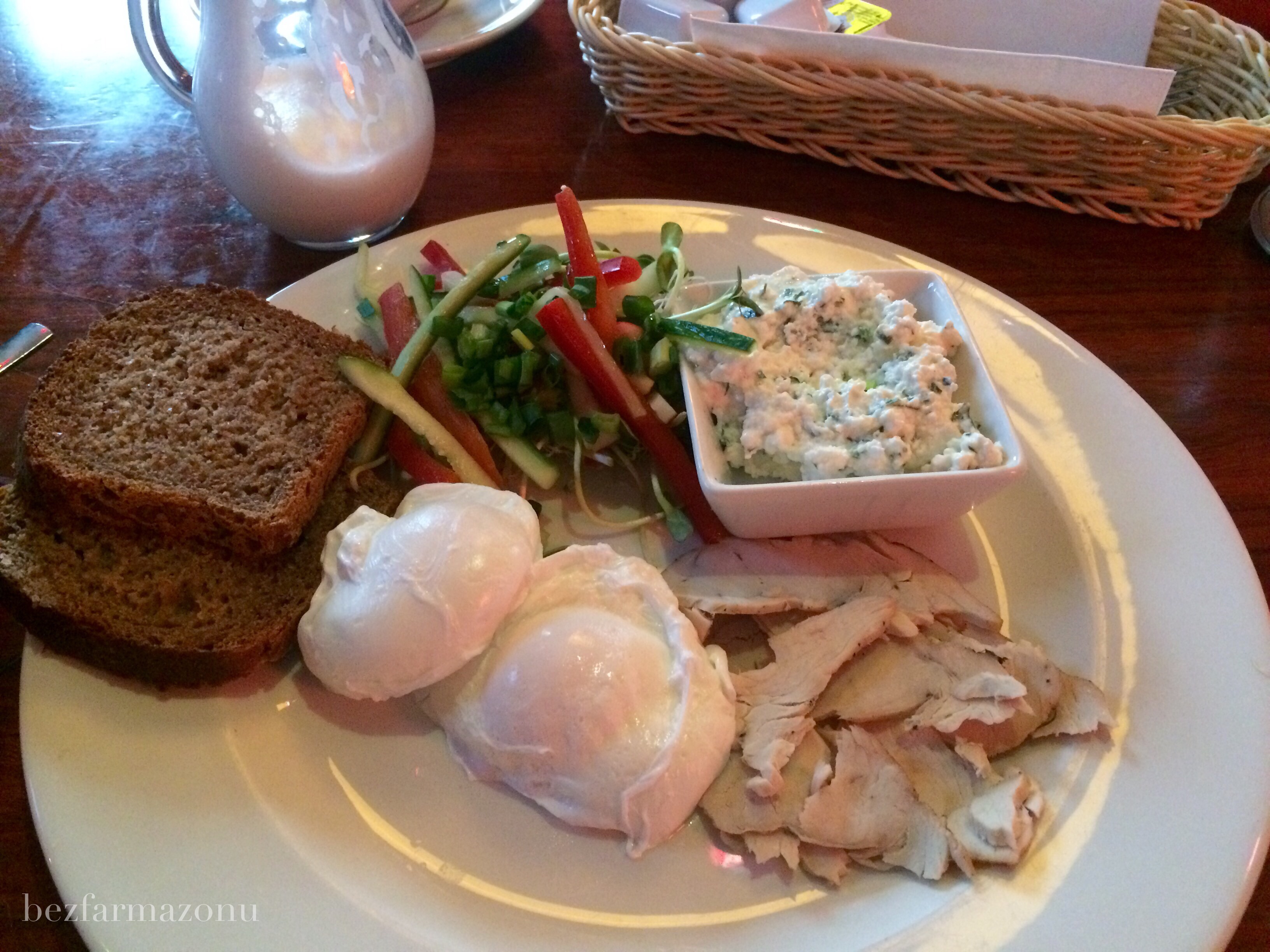 - śniadanie fit (16 PLN) składające się z: dwóch kromek razowego pieczywa na zakwasie (trzy takie byłyby idealne), twarożku ze szczypiorkiem, około 70g szynki z indyka, delikatnej sałatki z ogórka, papryki, kiełków i szczypiorku oraz dwóch jajek w koszulkach. Wszystko bardzo smaczne i świeże, nie mam żadnych zastrzeżeń.