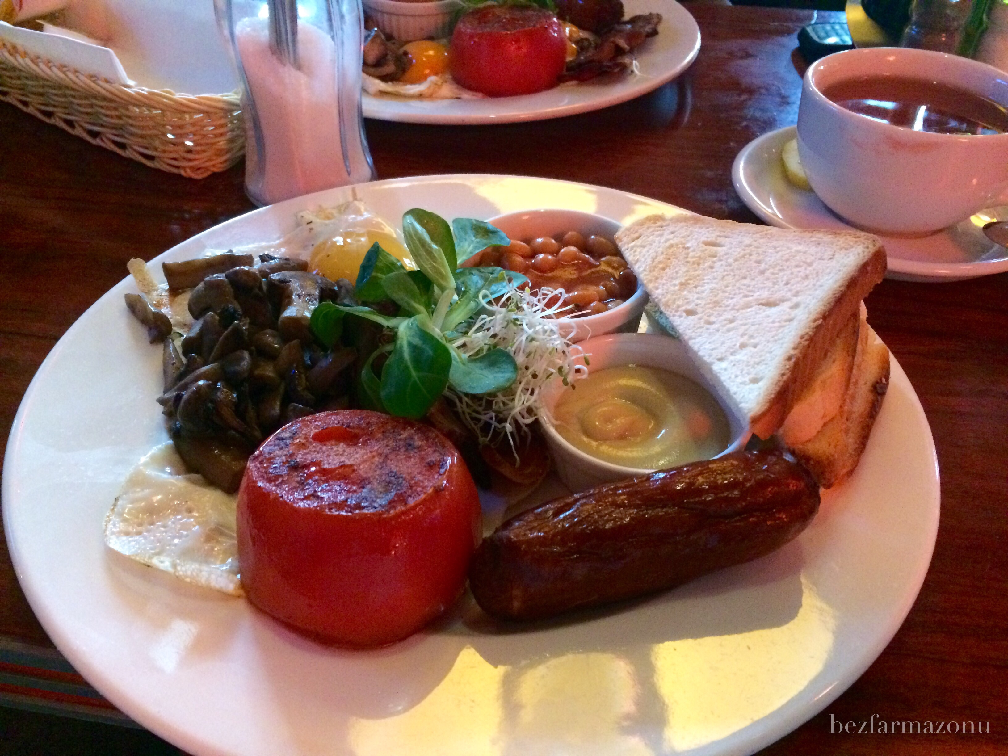 - śniadanie angielskie (18 PLN) z bekonem, fasolką, grilowanym pomidorem, kiełbasą, dwoma sadzonymi jajkami, pieczarkami i trzema kromkami pieczywa tostowego. Towarzysze bardzo zadowoleni, spróbowałem kiełbasy – bardzo dobrze usmażona i drobno zmielona bez żadnych chrząstek czy kawałków tłuszczu, mocno przypieczony bekon dobrze chrupał.