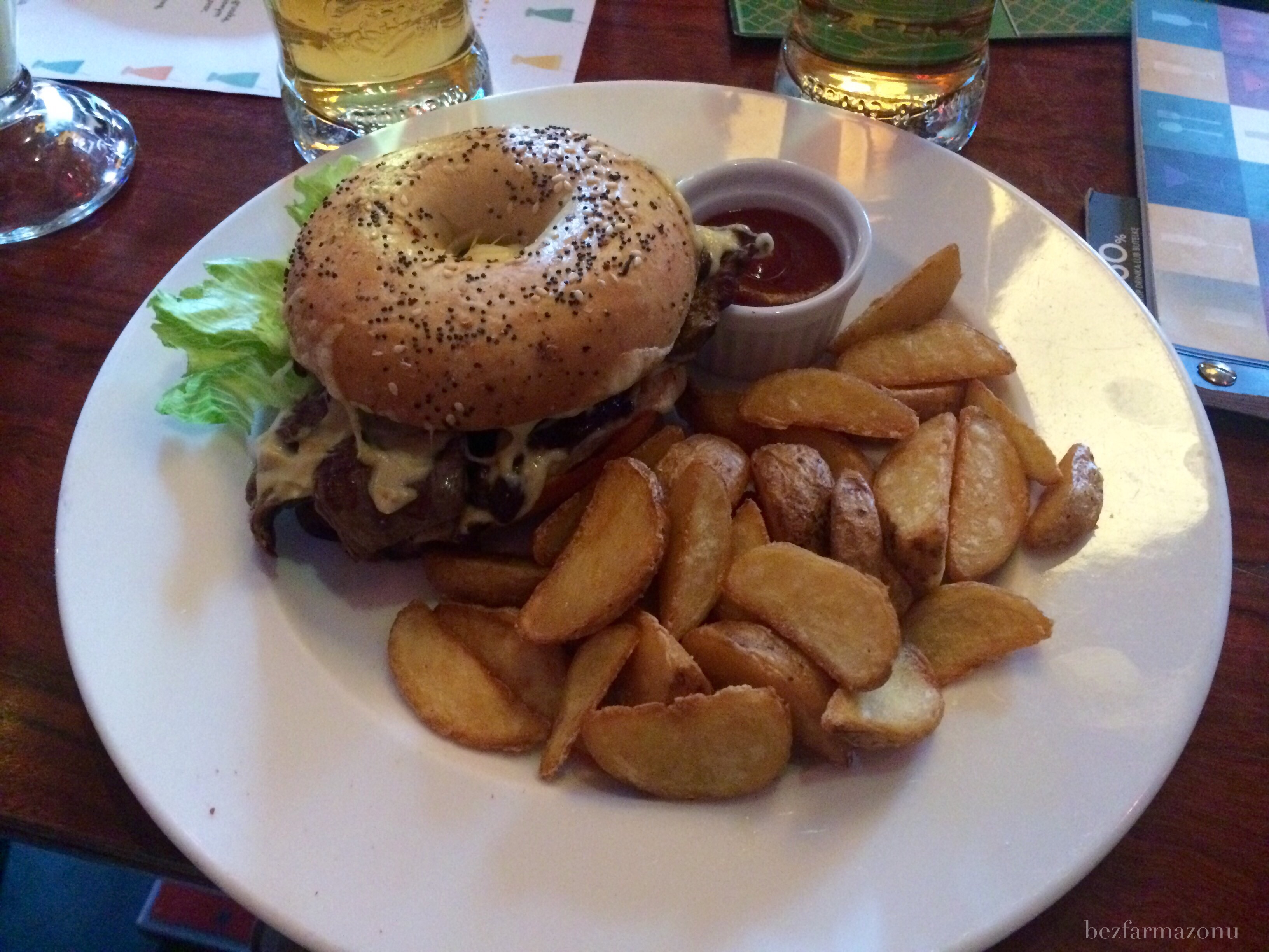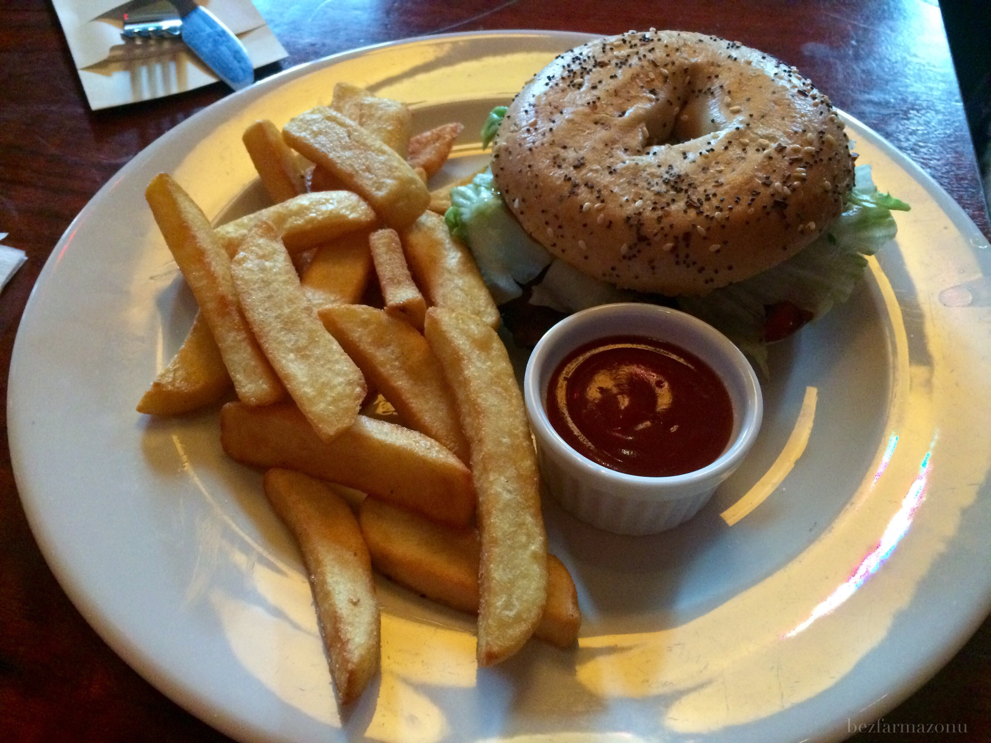 - bajgiel z kurczakiem BBQ i frytkami (27 PLN) – D. zachwalał bajgla, pierś i sos – we dwóch zgodziliśmy się co do frytek – były bardzo słabe, owszem lekko chrupiące, ale suche i o żadnym smaku.