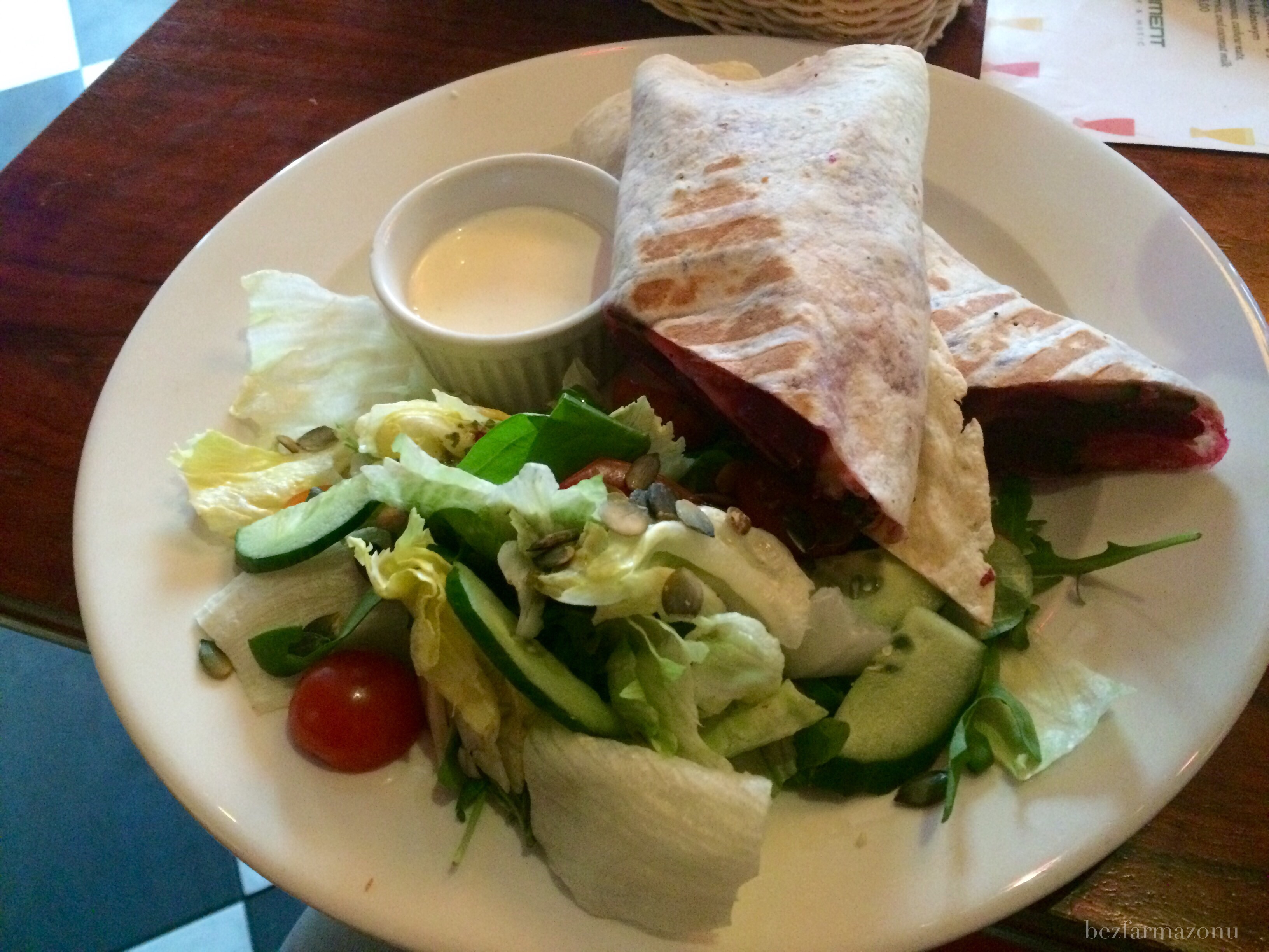 - tortilla z burakiem i kozim serem podana z mixem sałat i sosem czosnkowym (22 PLN) – bardzo dobra kwestia ilości do ceny – spora porcja, całkiem smaczne danie, które mi prawdziwemu mięsożercy wyjątkowo dobrze podeszło – kozi ser bardzo intensywnie podbijał smak, niechemiczny sos czosnkowy też na plus.