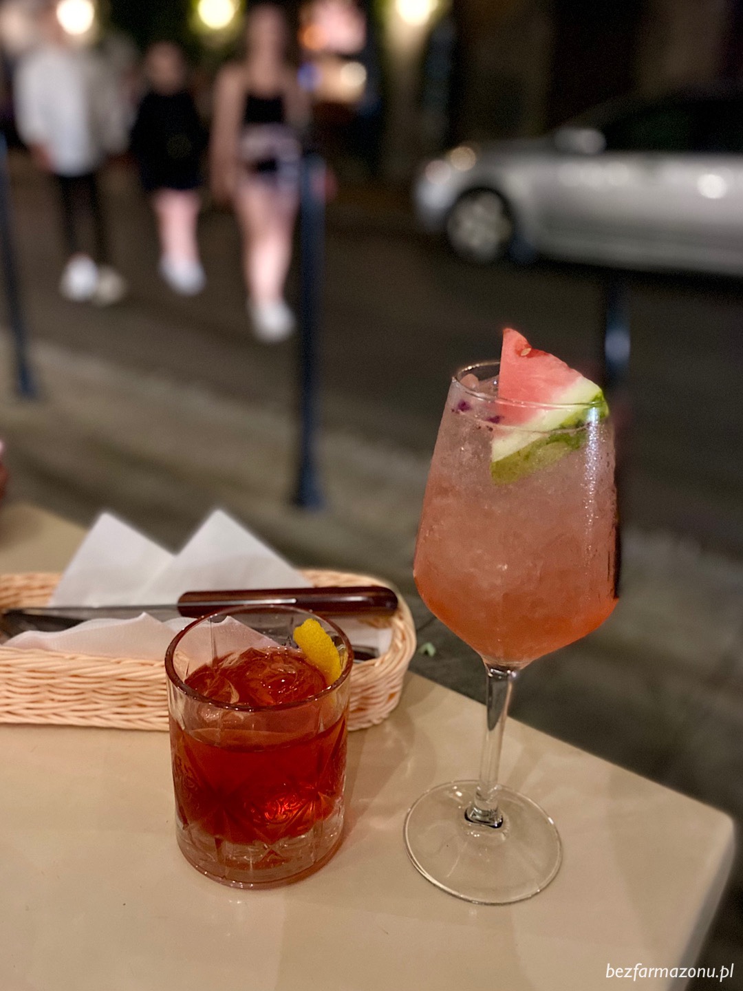 Tutaj nie mogło być inaczej i również zamówiliśmy „kolorki”: bardzo orzeźwiającego Arbuzowego Szprycera (27 PLN) oraz wytrawnego Negroni Ambrato (29 PLN).