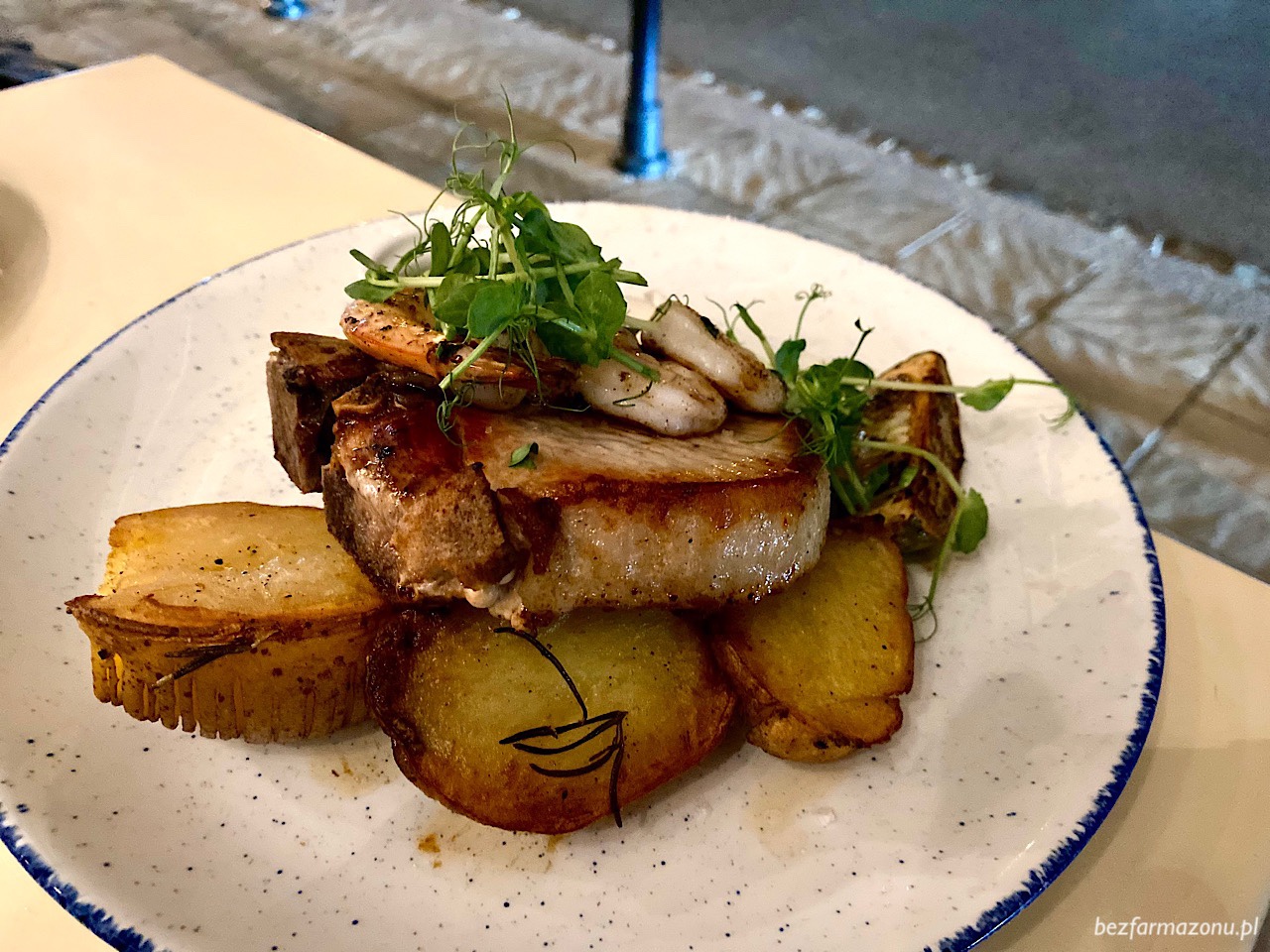 Schab surf & turf (45 PLN) zaskoczył sposobem przygotowania – niedość, że podany z kością, to dodatkowo bardzo gruby (3-4 cm) i smażony bez panierki. Jego mięso z racji wcześniejszego pieczenia w piekarniku było dosmażone nawet przy kości. Na tymże później usmażonym już na patelni kawale mięsa spoczywały cztery sprężyste tygrysie krewetki. Poziom węgli uzupełniały świetne i o dziwo świeże o tej porze ziemniaki hasselback. Słowa pochwały należą się pietruszkowo – czosnkowemu bazującemu na oliwie sosowi chimichuri. Nagroda w kateogorii najlepszego marynowanego warzywa tego roku leci do piklowanej kalarepy – ależ ona była rewelacyjna – idealnie octowa i dodatkowo słodka – prosta i pyszna.