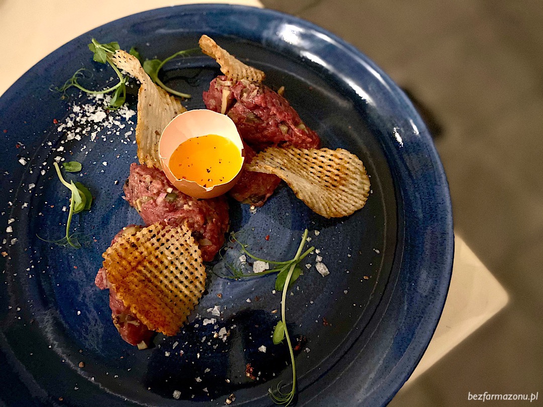 Tatar z polędwicy wołowej (39 PLN) również okey. Dobre mięso, wyczuwalne dodatki w formie szalotki, musztardy, konserwowego ogórka oraz marynowanych grzybów, gruboziarnista sól i pieprz rozrzucone dookoła na talerzu. Chipsy ziemniaczane raczej dla wizualnego bajeru – standardowe paczkowane są lepsze i bardziej chrupiące – te zanim trafiły na talerz chwile odczekały – nie stawiały żadnego oporu po zębami i po prostu brakowało im smaku.