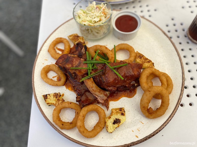 Ja skusiłem się na żeberka wieprzowe w podobno domowym paskudnym, rzadkim i chemicznym sosie bbq z względnie dobrymi, acz posolonymi od serca krążkami cebulowymi (wg słów kelnerki panierowanymi na miejscu, ale średnio chce mi się w to wierzyć), grillowanym ananasem oraz niezłym Coleslawem (41 PLN).