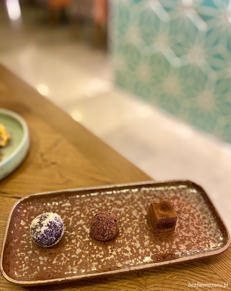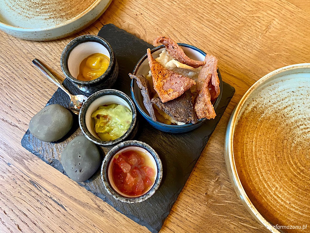 Po powrocie do stolika kelnerka uraczyła nas amouse bouche w formie fasolowej pasty zamkniętej w formie kamyczków w lichej i delikatnie twardej jakby kakaowej osłonce. Wraz z nimi podano przeróżne chrupaki oraz trzy pojemniki z: guacamole, salsą z kwaśnych pomidorów oraz pikantnym sosem mango (prawdopodobnie dzięki jednej z tych hardkorowszych odmian papryki).