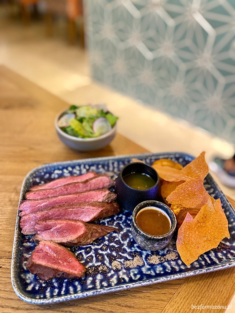 Flank steak (56 PLN) kompletnie do mnie nie przemówił. Łata wołowa nie jest szlachetnym mięsem i zamawiając tą pozycję liczyłem się z tym, że może się trafić żyłka czy jakaś twarda część. Jednak to nie tekstura okazała się kłopotliwa, lecz okrutnie mocny smak… wędzonki. W Ojo owy stek grilluje się na węglu drzewnym i prawdopodobnie ta technika stała za „wielkanocną” intensywnoścą smaku i zapachu wołowiny.