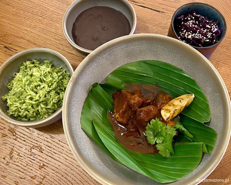 Niesamowicie aromatyczna, super miękka, wolno pieczona jagnięcina (59 PLN) „wciągnęła” cytrynową nutkę z liścia bananowca. Mięsu dotrzymywały towarzystwa: krem z czarnej fasoli (z jej małymi kawałkami), ryż z salsą verde oraz marynowana czerwona kapusta z białym sezamem.