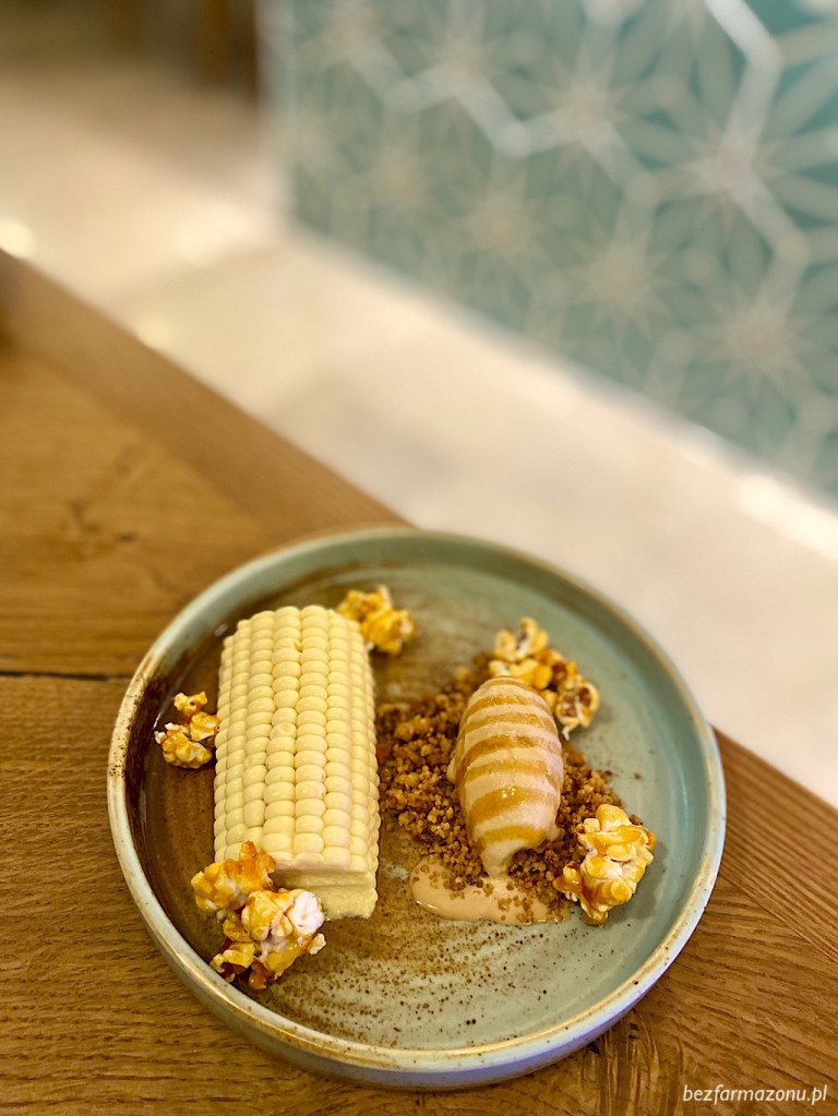 Pierwszym deserem z sekcji dulces był mus w kształcie kukurydzy (23 PLN) z turbosłodkim bananowym twistem, popcornem ze słonym karmelem oraz lodami na czymś a’la kruszonka. Średnio lubię bananowe aromaty, więc w tym cukierniczym wyrobie się nie zakochałem, ale szacun za kukurydzianą formę.