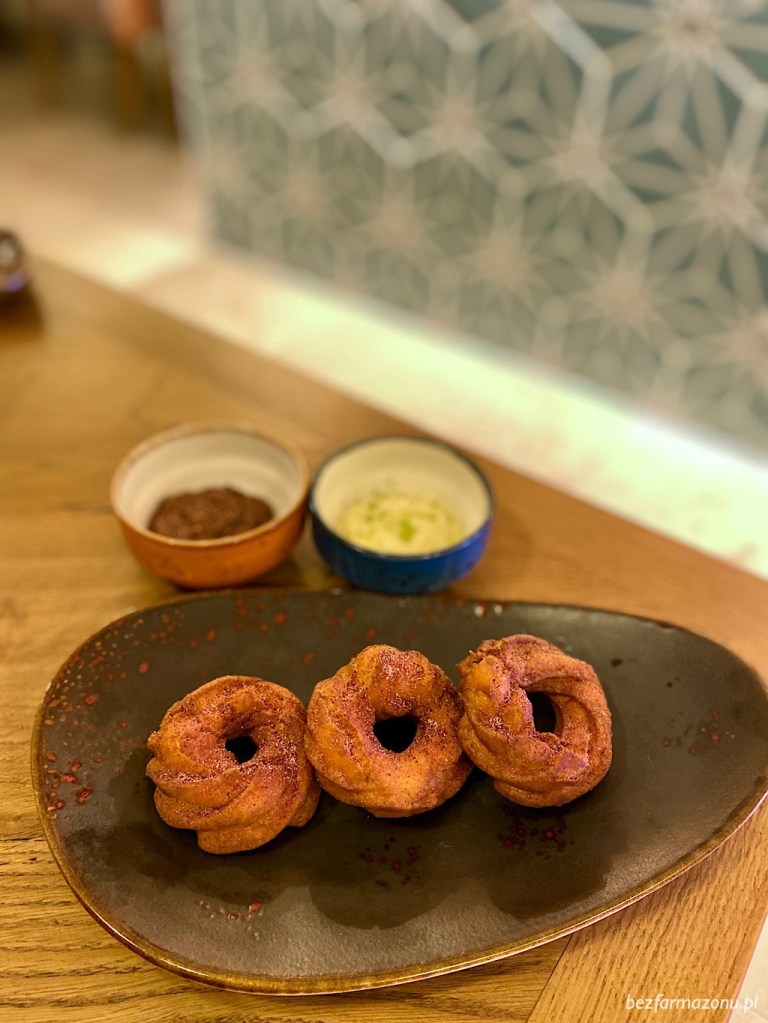 Drugi deser bez dwóch zdań trafił w dziesiątkę naszych podniebień. Ekstremalnie lekkie i puszyste, posypane odrobinę kwaśnym, orzeźwiającym hibiskusem churrosy (23 PLN) z niebiańskimi gęstymi kremami, które wyjedliśmy łyżeczkami do zera (no dobra głównie to ja wyjadłem): intensywnie czekoladowym oraz limonkowym również na czekoladzie lecz białej. Pyszność i doskonałość – bierzcie bez wahania!