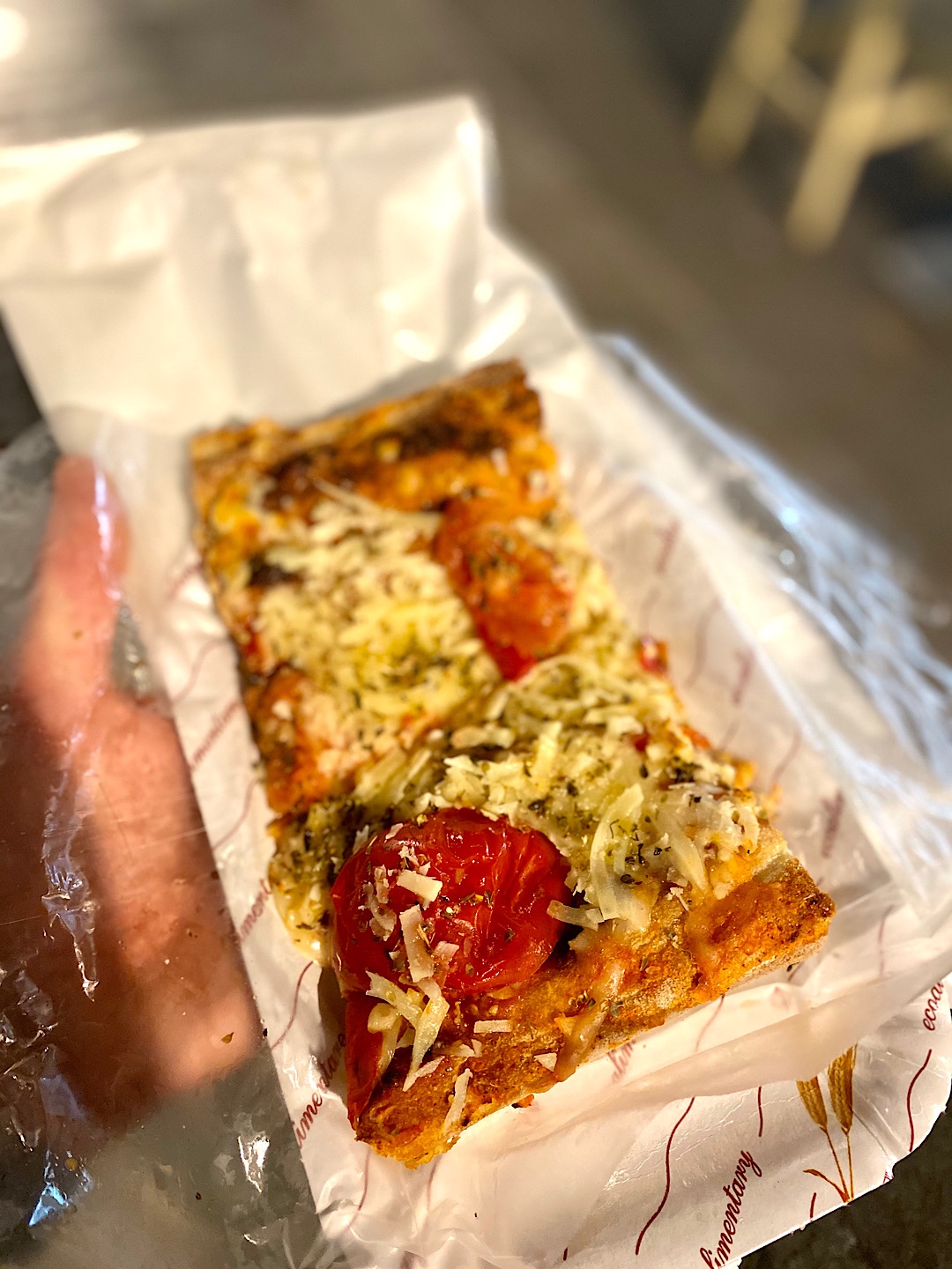 Oczywiście na każdym kroku dostaniecie również pizze na kawałki. Raz, z punktu z wiecznie sporą kolejką (BIGA Genio e Farina) się na takowy skusiłem, lecz wersja vege z parmezanem i koktajlowymi pomidorkami za 3 Euro wcale mnie nie zachwyciła.
