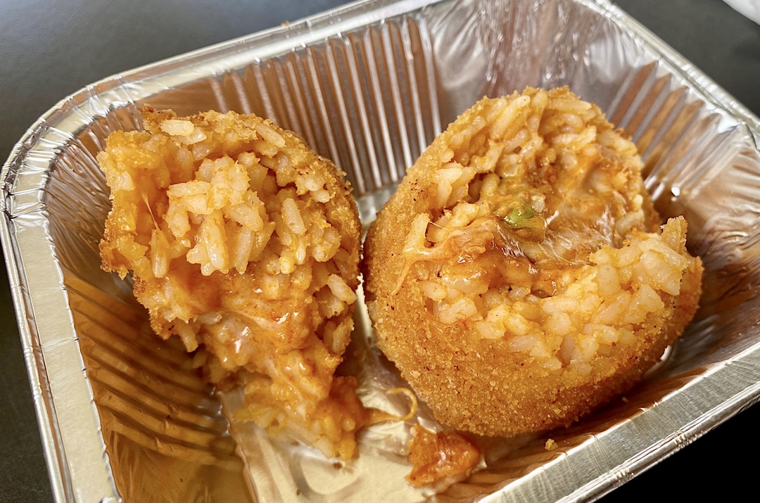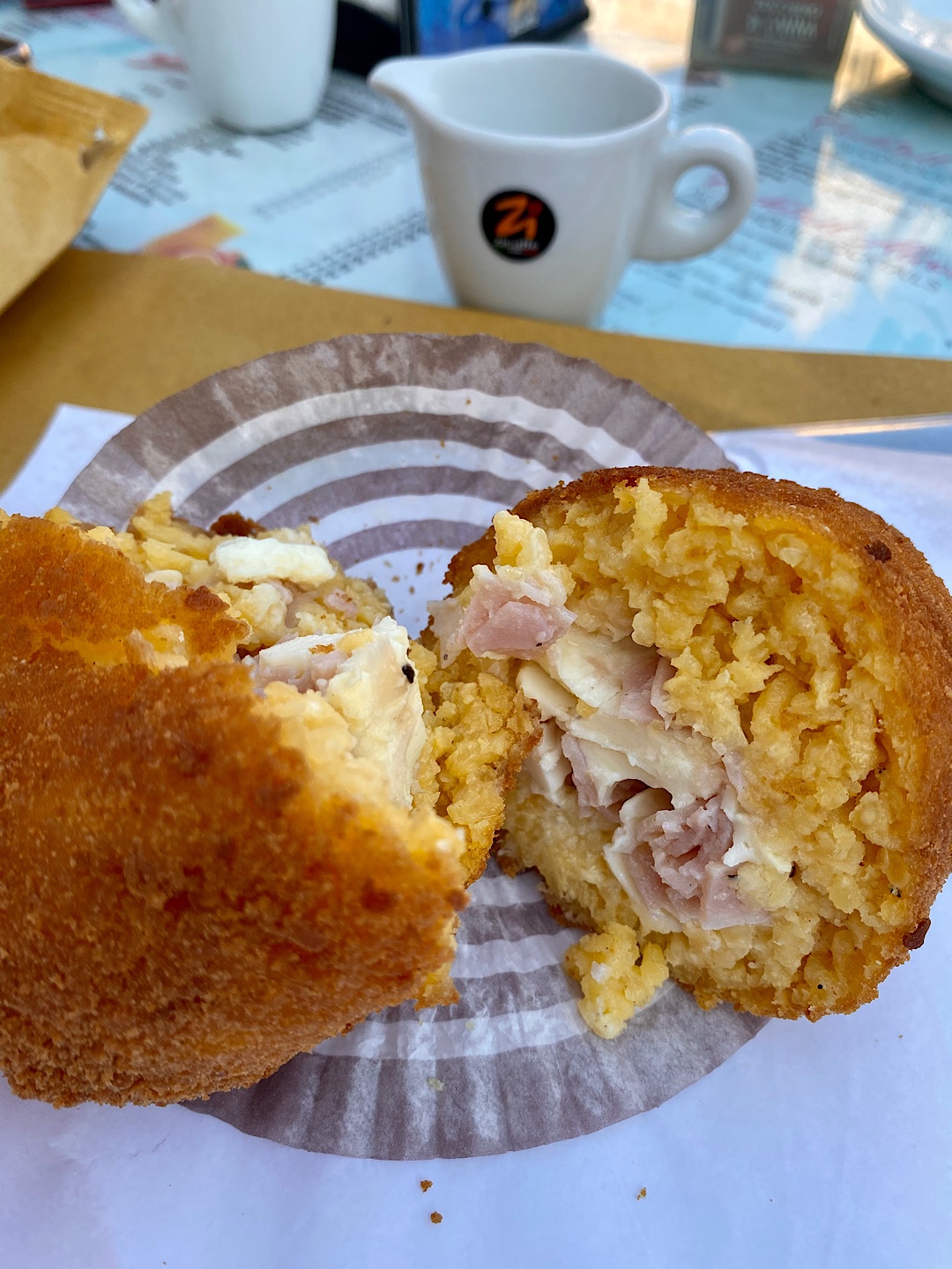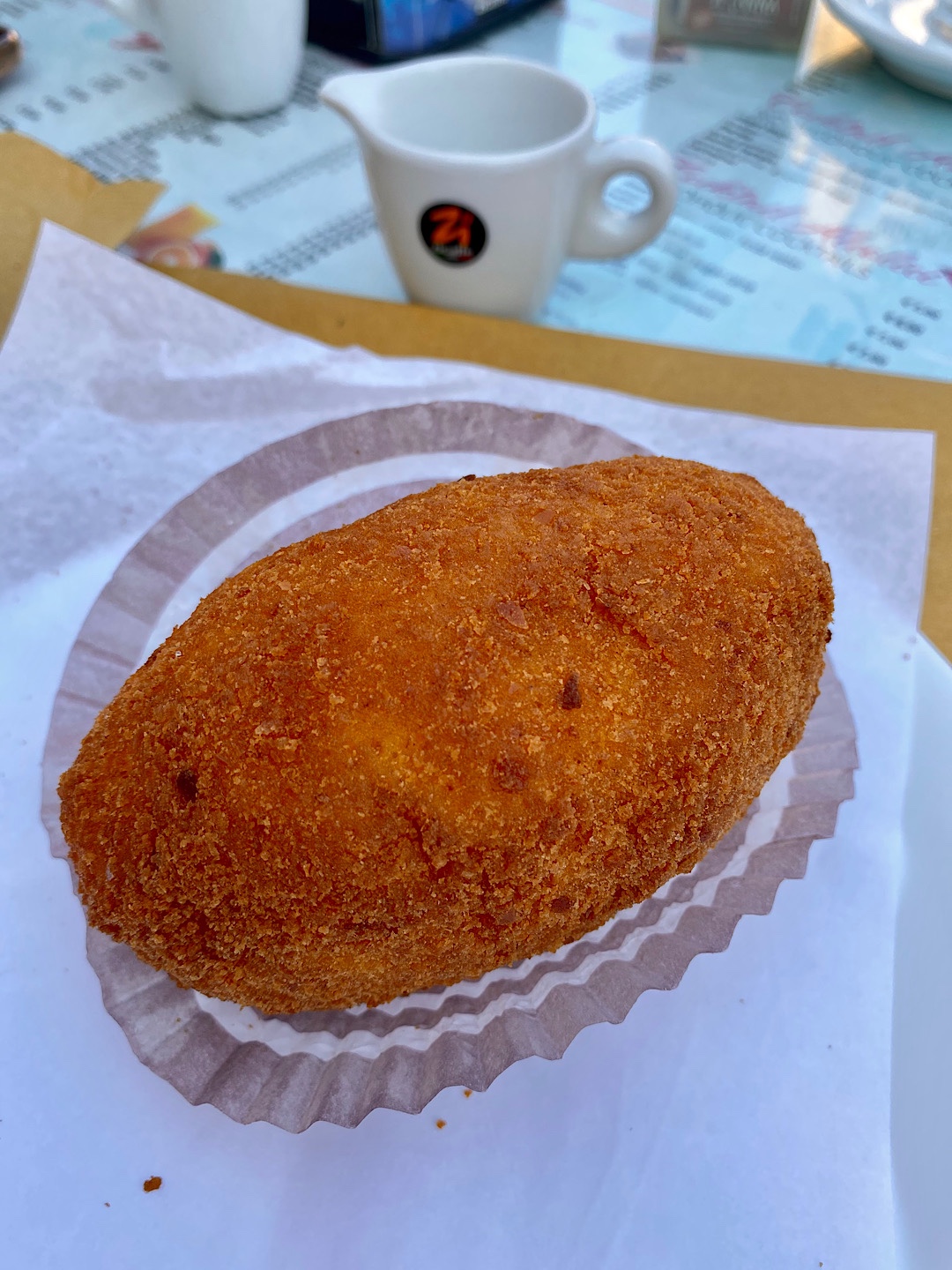 Zdecydowanie największą dostałem w Cefalu w kawiarni na placu przed katedrą. Pani szczerze przyznała iż kulki robione były na lunch i te kilka godzin później zostały dla mnie podgrzane, a nie usmażone na świeżo (to akurat częsta praktyka). Przez to że została zbyt krótko podgrzana, ser nie zdążył się roztopić.