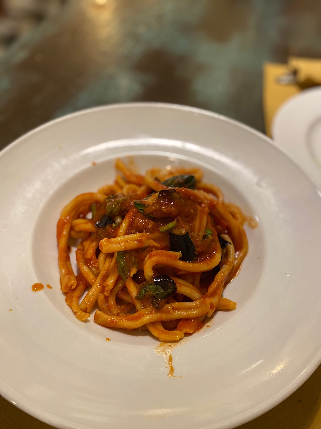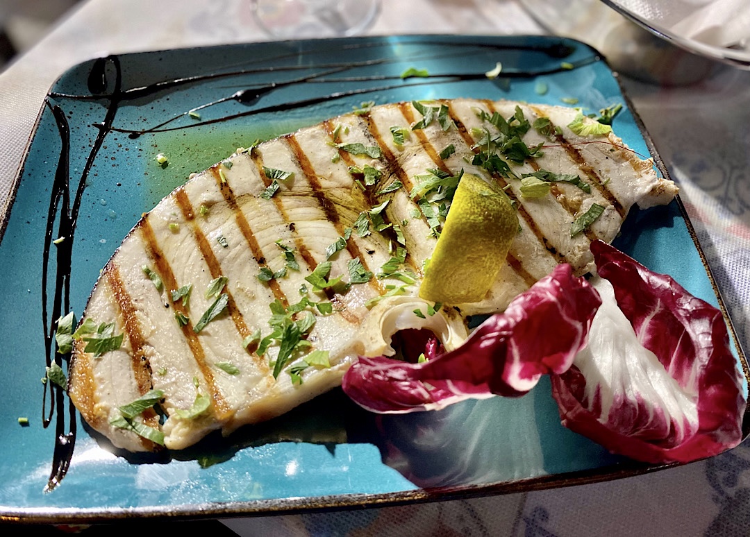 W karcie znajdziecie raptem po kilka pozycji w każdej z sekcji. My na przystawkę poprosiliśmy o tuńczyka macerowanego w marsali z minimalistycznymi kropkami sosu pomarańczowego (7 Euro) oraz najbardziej rozpoznawalne danie tej części Sycyli – pasta norma (5 Euro) – makaron z doskonałym pomidorowym sosem, bakłażanem, czosnkiem oraz pieprzem i solą. Proste i doskonałe.