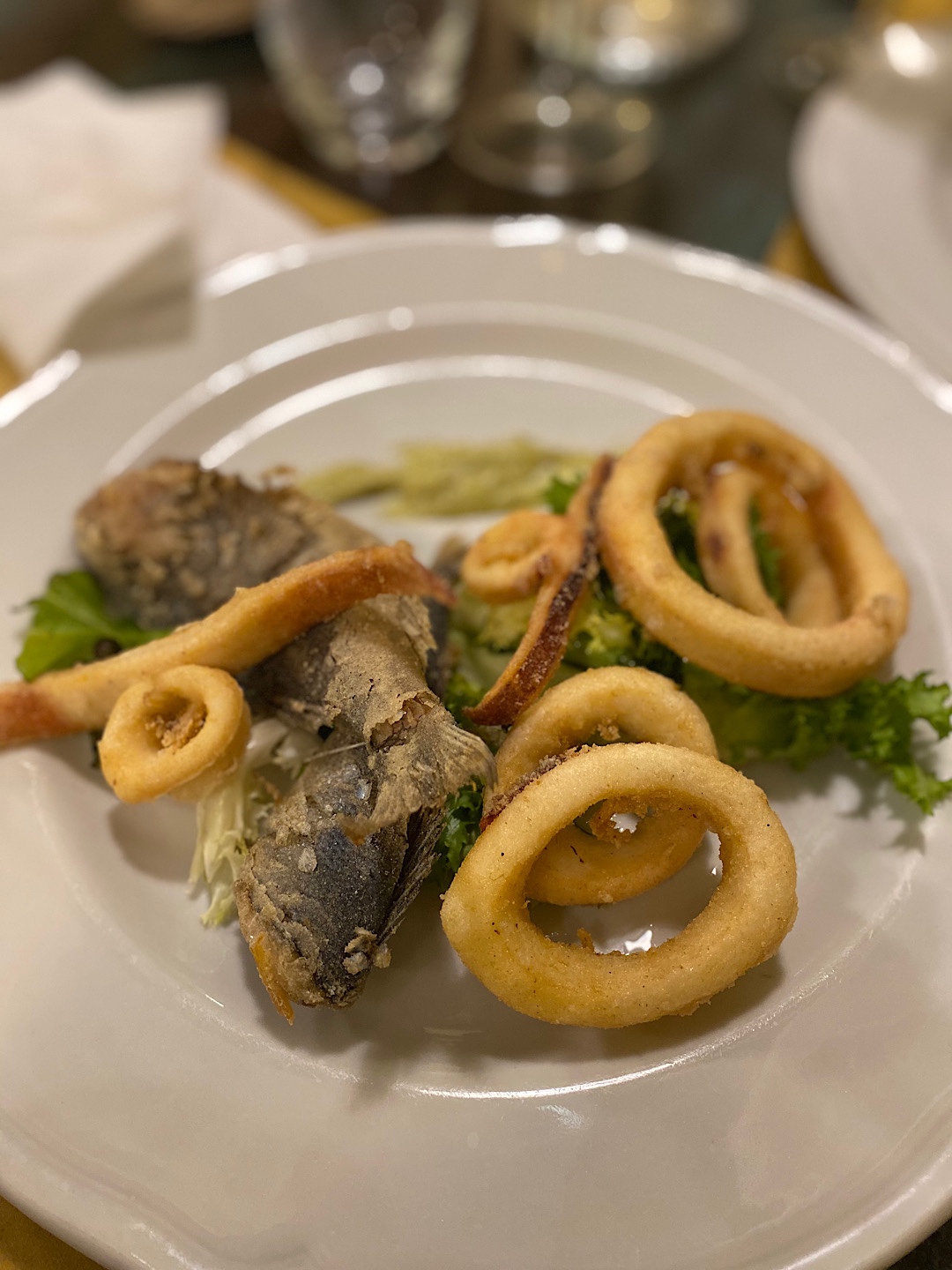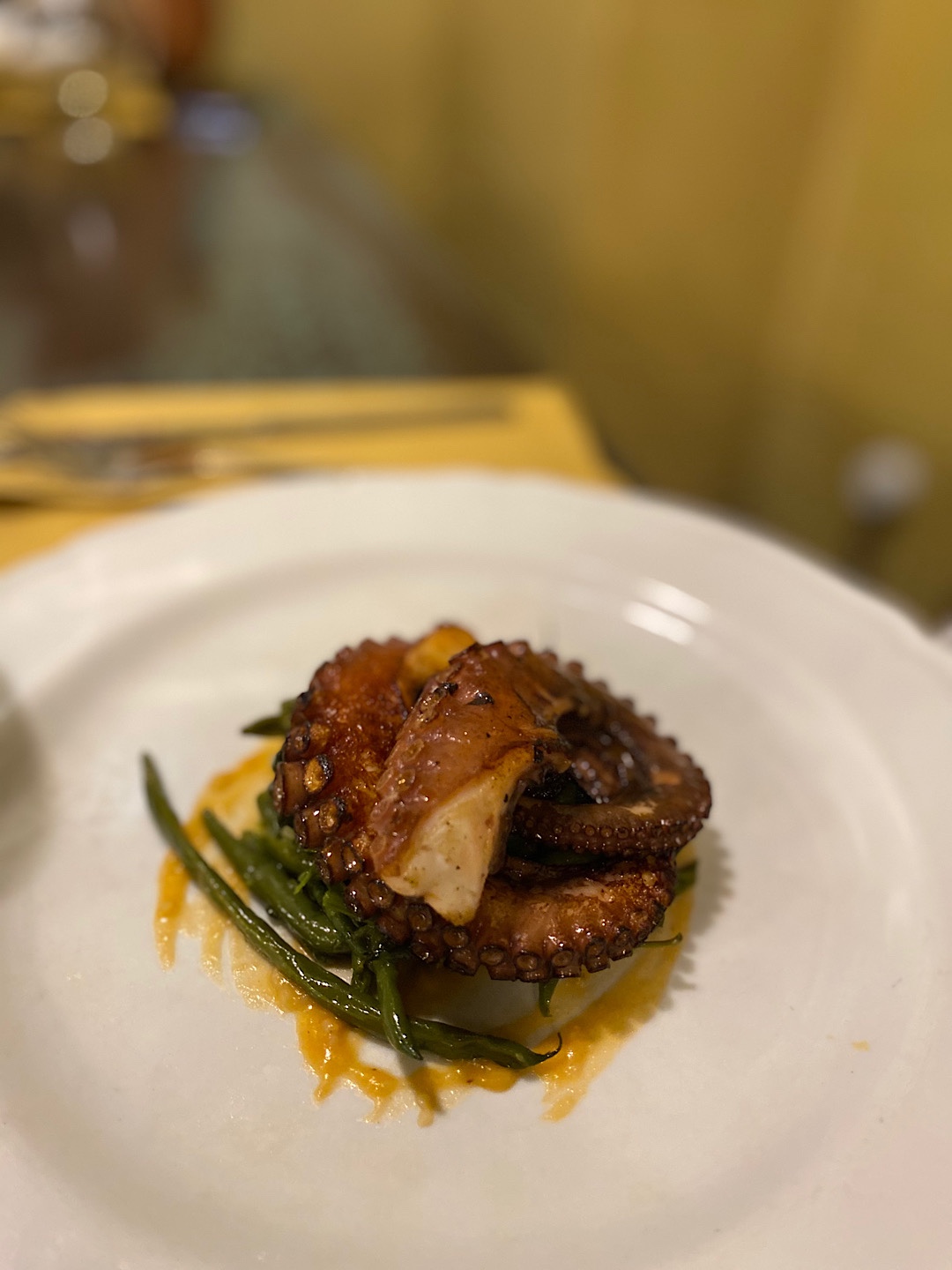 Mimo późnej godziny (około 9:30 PM) na tych dwóch talerzach nie poprzestaliśmy. Po odwaleniu ponad 25 tys kroków należało się nam coś jeszcze. W ramach dań głównych wzięliśmy frittura pesce (8 Euro) oraz ośmiornicę z fasolką szparagową (9 Euro). Obydwa komfortowe, perfekcyjnie przygotowane, po prostu świetne.